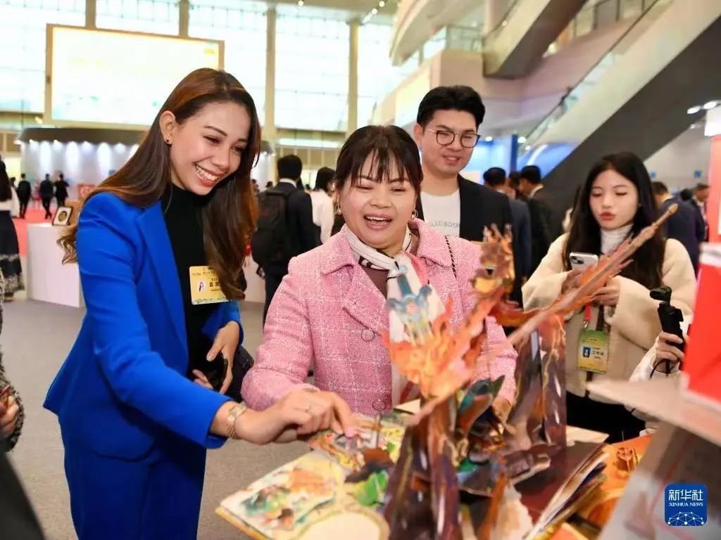 23级翻译专业陈灵怡为正在参观体验立体书文创产品的柬埔寨嘉宾蒙索菲尔·斯莉特(东盟女企业家协会顾问)协助翻译解说