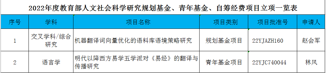 日前,教育部公布了2022年度人文社会科学研究规划基金、青年基金、自筹经费立项结果。我院两位教师获批2022年教育部人文社会科学研究基金项目,其中我院赵会军教授的《机器翻译词向量优化的语料库语境策略研究》获批规划基金项目立项,林风副教授的《明代以降西方易学五学派对〈易经〉的翻译与传播研究》获批青年基金项目立项。