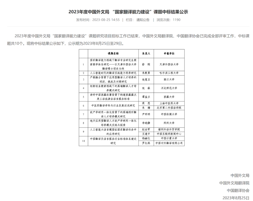 近日,中国外文局公示了2023年度“国家翻译能力建设”课题研究项目中标结果,经过全国范围内的激烈竞争,我院赵会军教授领衔申报的《人工智能大语言模型在国家翻译任务中的应用研究》项目中标“国家翻译能力建设”课题研究项目。