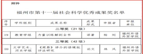 日前,福州市人民政府公布了“福州市第十一届社会科学优秀成果奖”获奖名单,我院喜获两项奖项。其中,杨刘助教的译著《力量训练解剖全书》在教育学组获二等奖;林风副教授的论文《<周易>译介的语境批评法研究》在文学艺术、历史学组获三等奖。