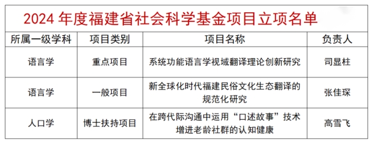司显柱教授申报的“系统功能语言学视域翻译理论创新研究”项目获得语言学重点项目立项;张佳琛副教授申报的“新全球化时代福建民俗文化生态翻译的规范化研究”项目获得语言学一般项目立项;高雪飞博士申报的“在跨代际沟通中运用‘口述故事’技术增进老龄社群的认知健康”项目获得人口学博士扶持项目立项。