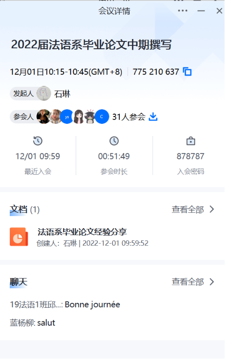 2022年12月1日10点,法语系教师石琳面向法语系19级学生开展了毕业论文中期撰写指导、写作规范强调的主题讲座。