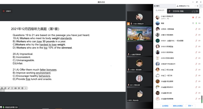 2022年11月29日下午15:00-16:30,外国语学院公共外语教研部蒋颖老师在腾讯会议平台为财金学院的200多位学生开设题为“大学英语四级考前复习规划指导”。通过基础复习、题型突击、锦上添花、仿真模拟、平和心态五个方面对学生予以四级备考的指导,并以真题为例带领同学们进行实际应用,最后通过答疑的方式解答同学们的困惑,讲座效果良好。
