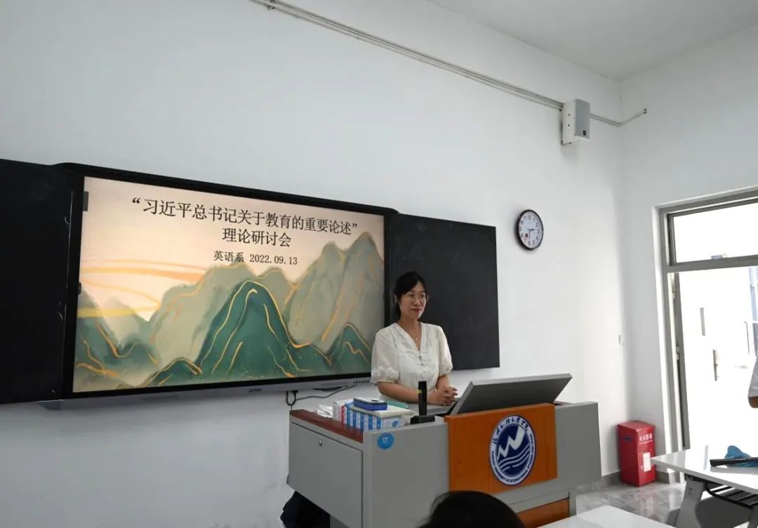 翻译系以“习近平与福建教育故事”为主题展开讨论。会上教师们学习了习近平总书记就推动教育发展发表一系列重要讲话。李蕊副教授提出教师在专业课教学上要深化新时代学校思想政治理论课的改革创新,坚持不懈用习近平新时代中国特色社会主义思想铸魂育人,把好政治关、师德关、业务关,推动思政课“活起来”、教师队伍“强起来”、工作合力“聚起来”。