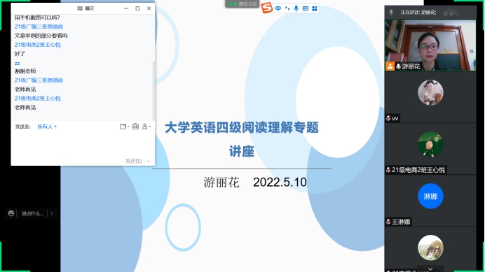 为了让同学们了解大学英语四级阅读的考试题型和掌握阅读部分的答题技巧,更好地迎接即将到来的大学英语四级考试,我院游丽花老师于5月10日下午在腾讯会议开展了一场题为“大学英语四级阅读专题”的讲座。讲座从四级阅读的考试题型、分值分配、时间分配、解题技巧、前期准备五个方面进行讲解。