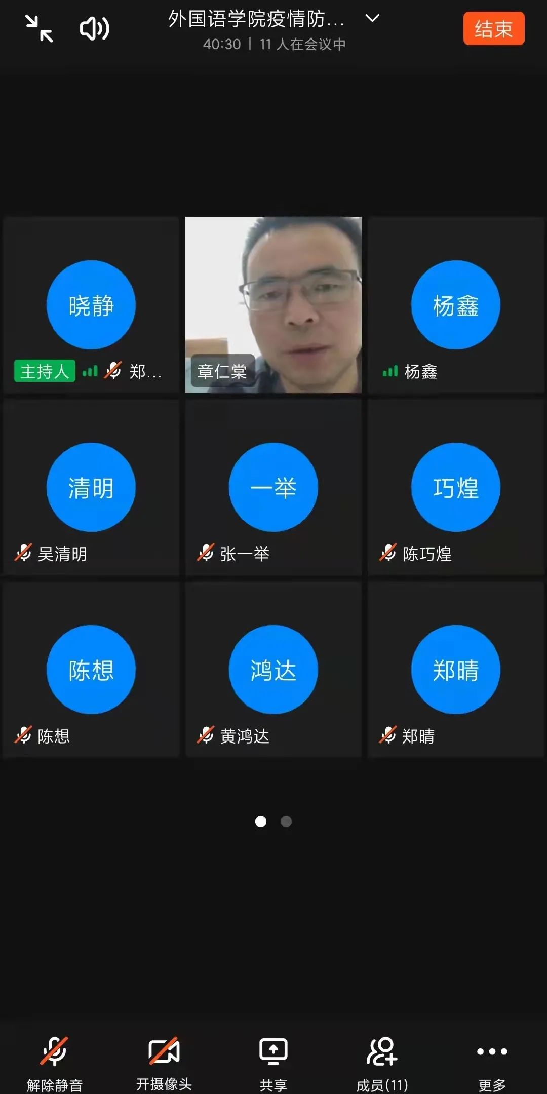 近期我国疫情多发频发,防控形势复杂严峻,有些地方已经出现校园暴发聚集性疫情,为进一步强化校园疫情防控,3月12日,外国语学院学工系统2022年春季疫情防控会议在钉钉平台召开,学院党委书记章仁棠、办公室副主任郑晓静及全体辅导员参加会议。