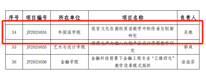 近日,我校正式公布2024年度教育教学改革研究项目立项名单。我院申报的三项课题三项课题脱颖而出,成功获批校级教改项目,分别为:《地方高校大学生外语学习的非智力障碍因素及其个性化辅导对策实证研究》(负责人:朱淑芳副教授)、《生成式人工智能辅助高校英语写作教学的方式与效果研究》(负责人:陈晓丹副教授)、《侯官文化在高校英语教学中的传承与创新研究》(负责人:吴晓副教授)。此次立项充分体现我院教师在英语教学改革领域的创新探索,为构建校本特色教学模式提供了新的研究路径。