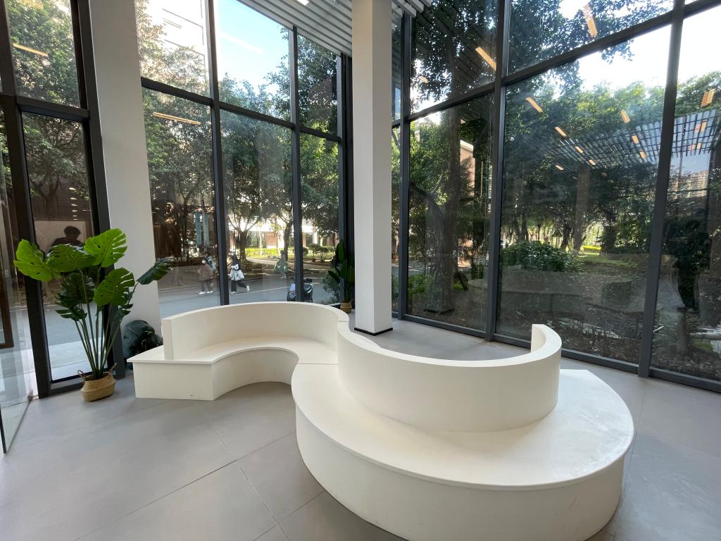 门内设置了休闲区域向落地窗外望去仿佛置身植物园让人身心放松课间在此小憩或是与同学交流都是不错的选择