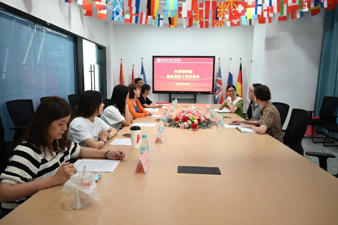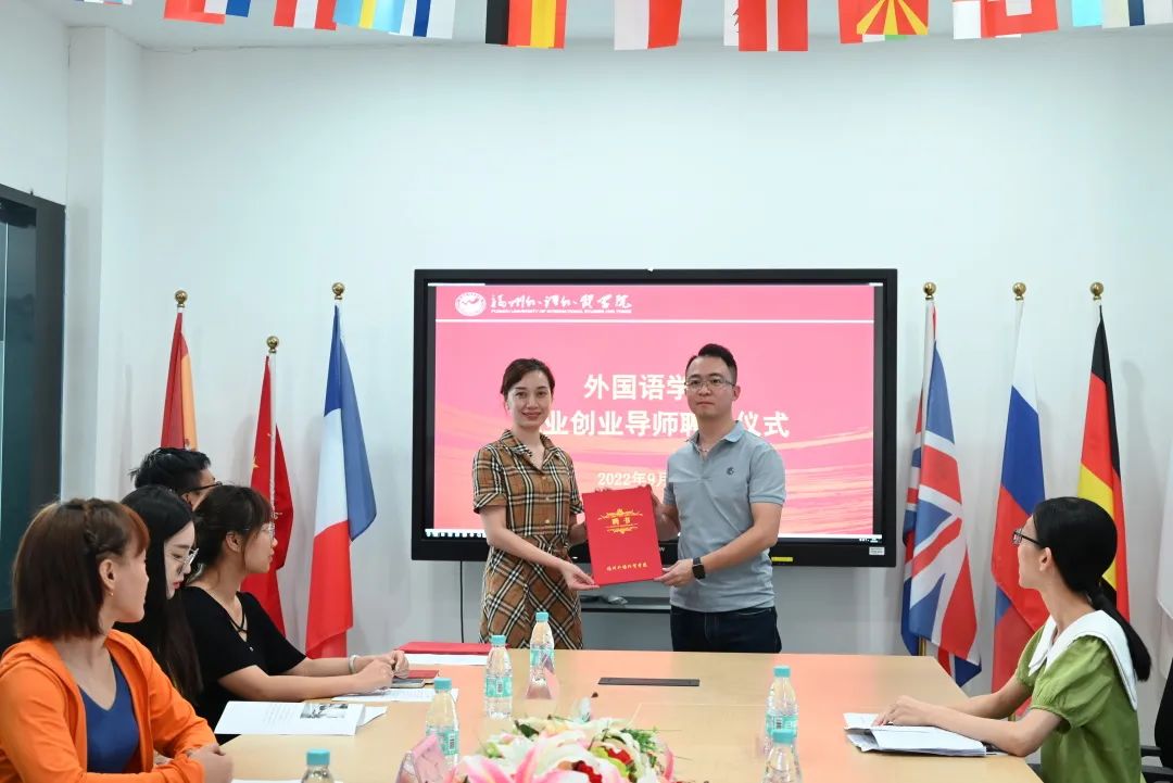 9月20日下午,外国语学院举行就业创业导师聘任仪式暨外国语学院校企合作和就业创业工作交流会,副院长杨俊惠,副院长、分党委书记杨惠容,各系主任参会。会上,学院聘任李荣聪先生为就业创业导师,聘任仪式后,学院就2022届外语类专业毕业生就业情况进行了介绍,双方就深化校企合作,产学研深度融合,开展产业实践班、学生专业认知实习、毕业实习等实践内容进行了交流,并达成了初步合作意向