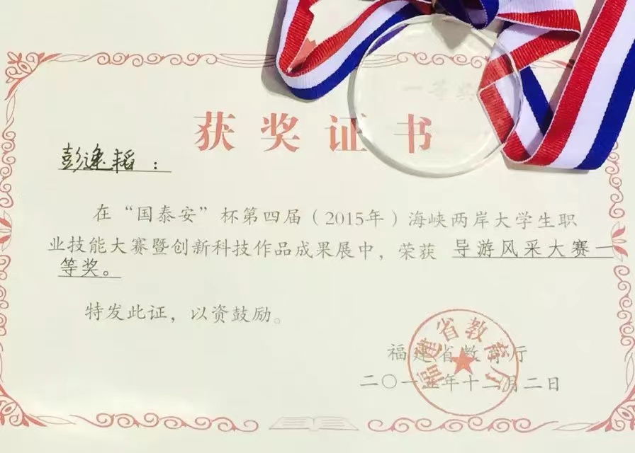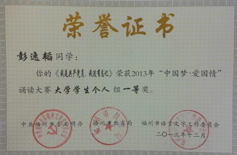 在福外求学期间,他从班级团支部书记、学院团委学生会办公室干事做起,历经学院主持团团长,文体中心主任,最后到外国语学院学生会主席。这期间,他参加了很多工作和比赛,组织大型活动,个人能力和综合素质得到很大提升,也获得了很多荣誉,比如:“福建省气象主播电视选拔赛全省十强”荣誉称号、“第四届海峡两岸大学生导游风采大赛”一等奖、“福建省大学生志愿者暑期‘三下乡’社会实践活动先进个人”称号、“福州市红色经典朗诵大赛”一等奖等等。之所以能取得这么多的成绩,是因为福外大爱教育情怀,“融会中外,经世致用”的校训,“善言、善心、善行”的教育理念,以及应用型人才培养目标,一路伴随着他成长!在此,他要特别感谢母校,“是您培养了我,教育了我,发现了我,昨天我以母校为荣,今天母校以我为荣”。