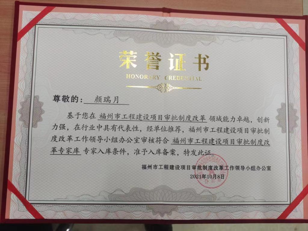 “不行,我来”这四个简单的字,却是她这么多年在工作上说的次数最多的话。秉持着不畏困难,不惧挑战的精神,在这个带着偏见的“女子不如男”的行业里,一次次征服工程团队,带领项目团队主动作为、克服困难、不做作不娇气,完成各项指标。工作之余仍努力学习,短时间内考取了工程二级建造师、工程助理工程师等行业相关证件,为更出色的工作添砖加瓦。她在工作中始终坚持把自身专业运用在建设一线,积极联合政府相关部门开展优化营商环境系列工作,为企业、群众办事开创新模式、新思路,帮助公司“国贸榕上”项目成为福州市自然资源和规划局首个“不见面审批”项目。她因为专业能力突出入选福州市工程建设项目审批制度改革工作指导小组专家库(福州市唯一一个),并担任福州市政务服务中心服务体验官(首批)。