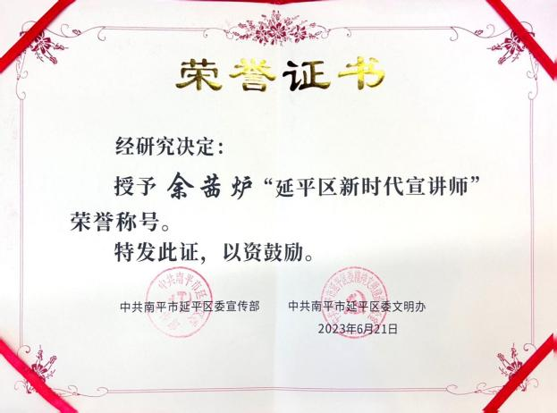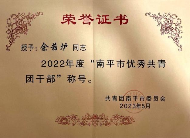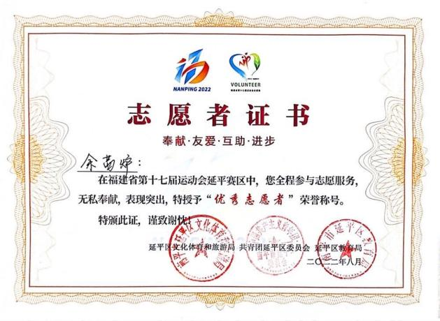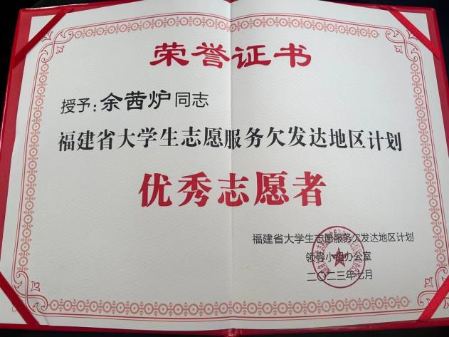 2021年8月,她以福建省志愿服务欠发达地区计划志愿者的身份来到工作地——南平市延平区赤门乡人民政府,2023年7月服务期满,现已转为事业单位在编干部,继续在基层奉献青春,施展才干。工作期间,她先后获得福建省第十七届运动会延平赛区“优秀志愿者”、2022年度“南平市优秀共青团干部”、延平区新时代宣讲师、延平区“深学廖俊波 ‘三争’作表率”演讲比赛二等奖、福建省大学生志愿服务欠发达地区计划优秀志愿者等荣誉。