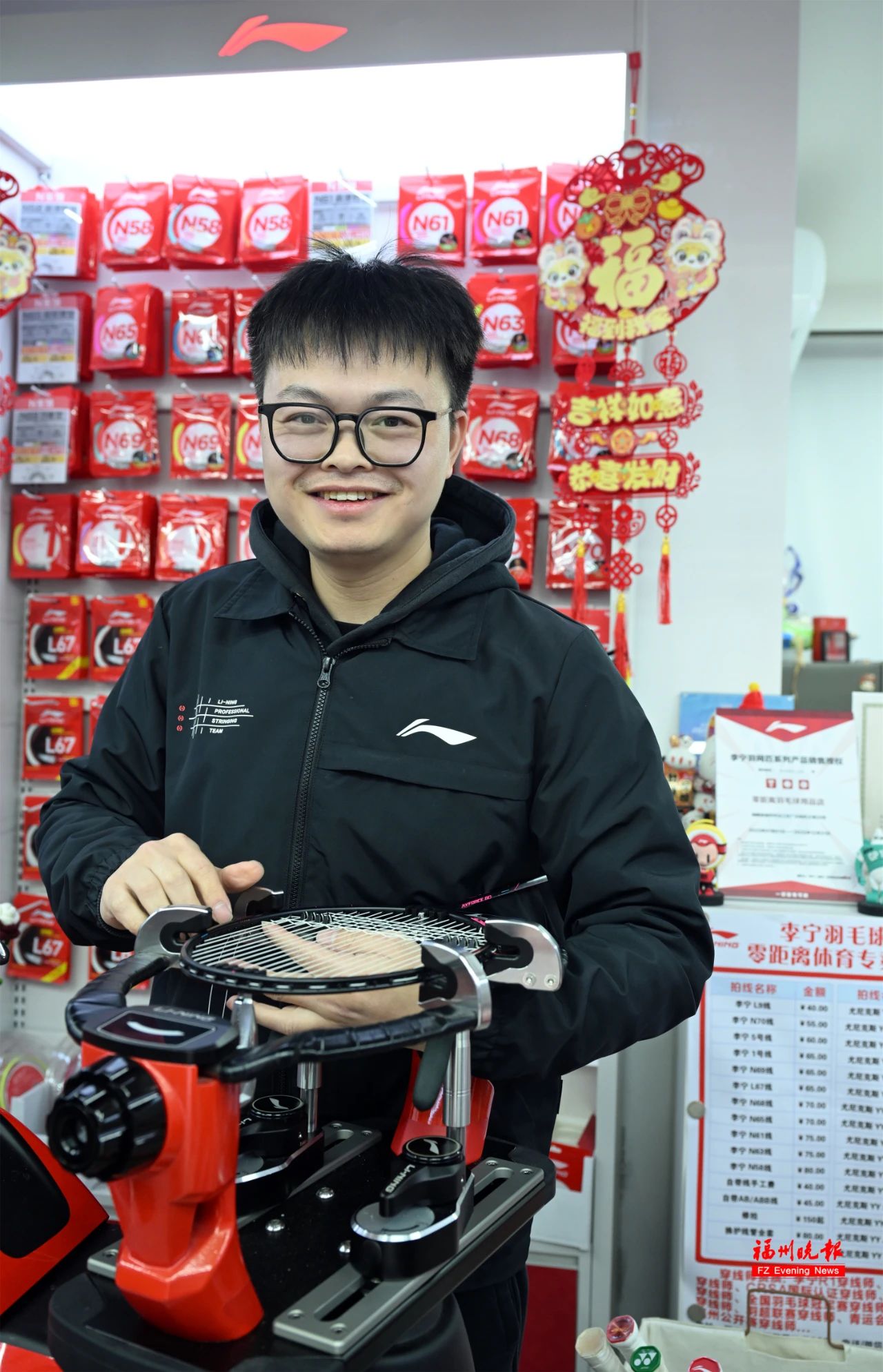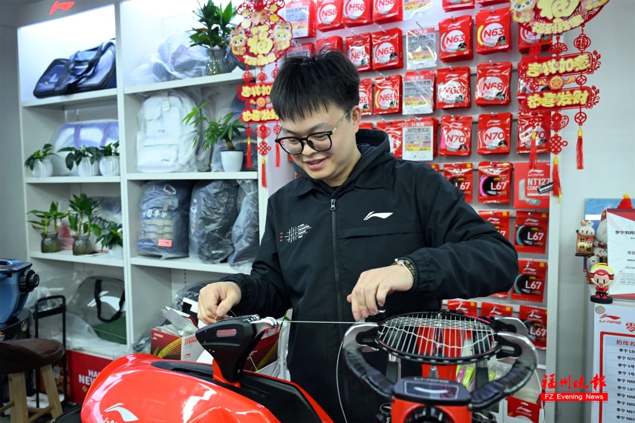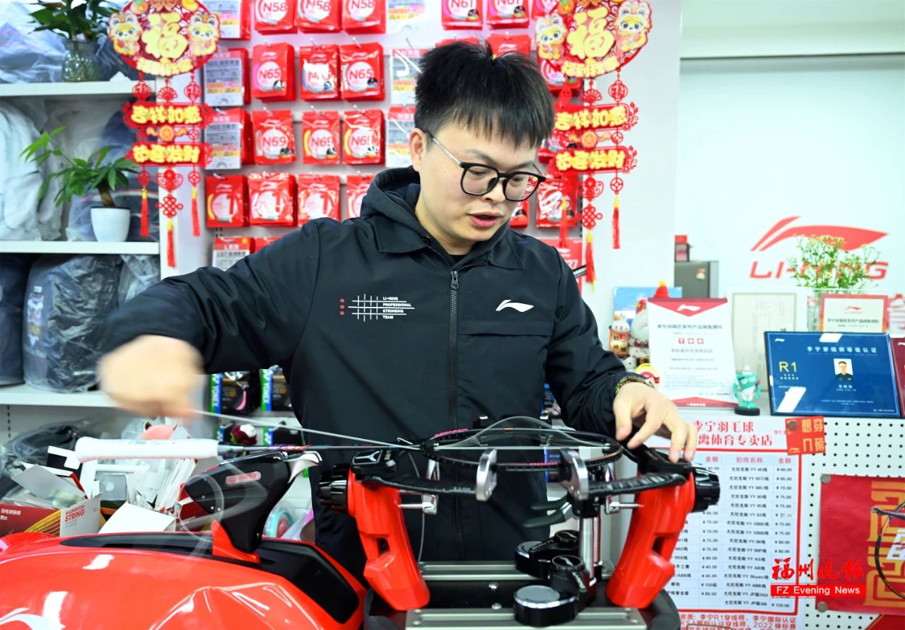 走进黄晓林自己开的羽毛球用品店,各式各样的羽毛球拍和专业的穿线工具映入眼帘。他正全神贯注地为一只球拍穿线,动作娴熟而流畅,仿佛在进行一场精妙的艺术创作。