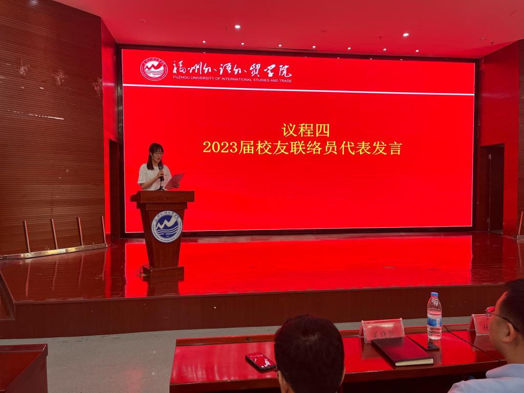 2023届国际经济与贸易专业夏旭代表2023届校友联络员发言,他充分表达了对母校骄傲与感恩之情,号召校友联络员要“心系母校,发扬福外精神”,“薪火相传,积极献言献策”,“胸怀感恩,常回母校看看”。
