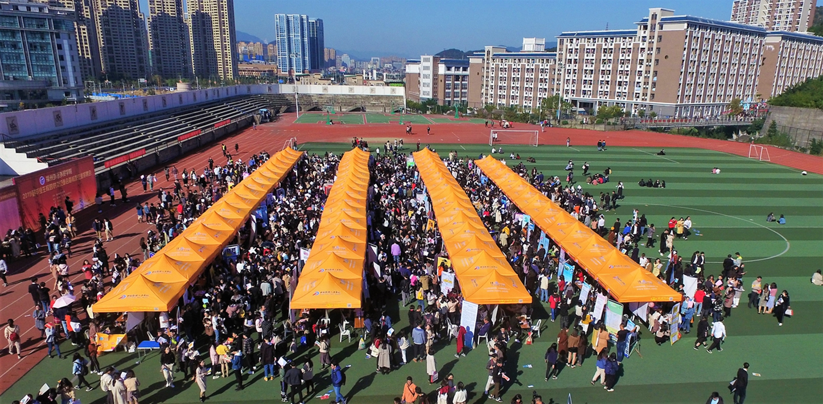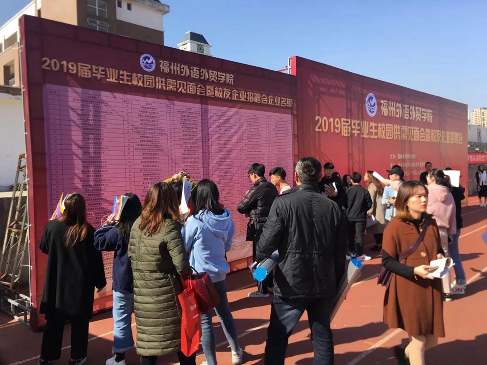12月18日,福州外语外贸学院2019届毕业生供需见面会暨校友企业招聘会在校田径场成功举办,副校长、党委副书记徐国立等来到见面会现场,与招聘单位及毕业生交流,了解毕业生就业意向,勉励同学们准确定位,找好工作。