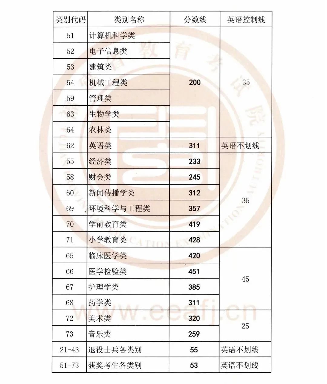 2020年福建省专升本各类别录取控制分数线