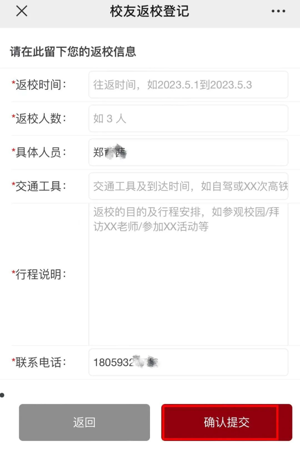 填写完整返校信息