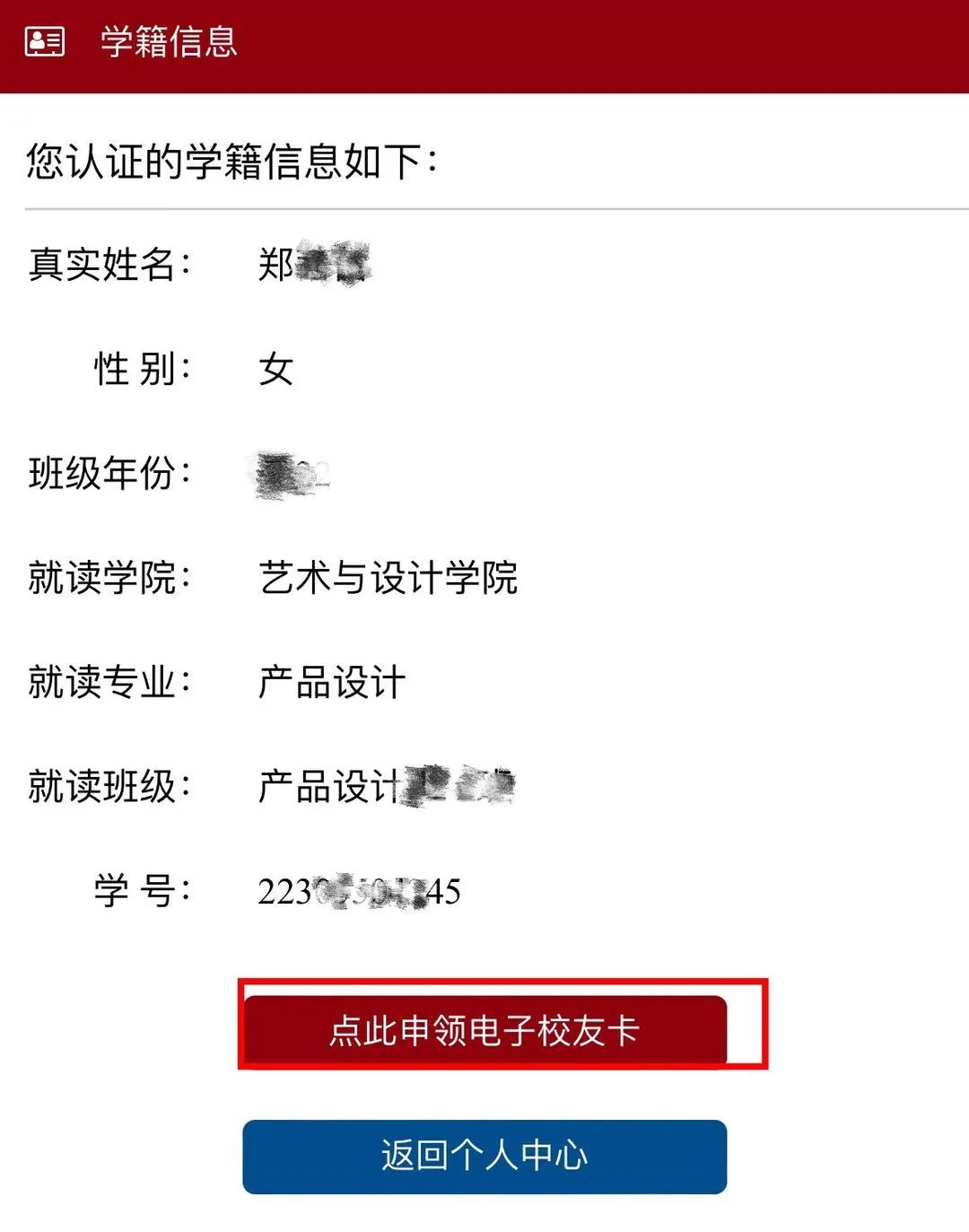 点击“点此申领电子校友卡”
