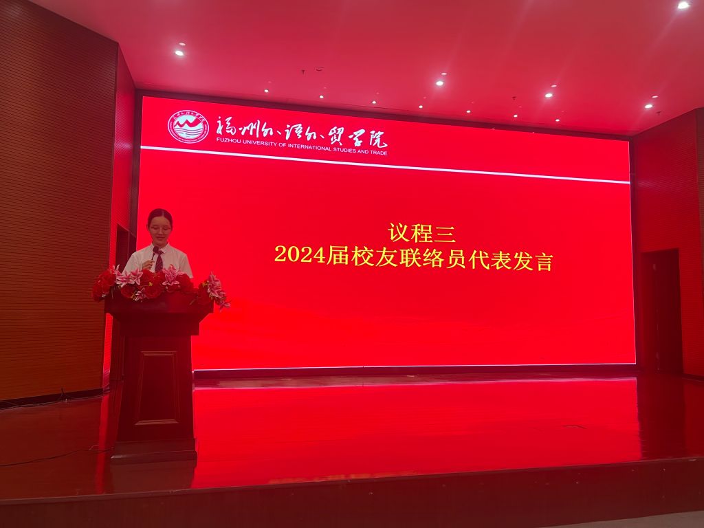 外国语学院2024届英语(睿思英才)1班陈贝琳代表发言,她充分表达了对母校的骄傲与深厚感恩,感激母校为他们提供优质的教育和成长环境,号召校友联络员要躬耕力行,化身沟通桥梁、凝心聚力,心系母校发展、锐意进取、争当先锋表率,一起创造更美好的未来。