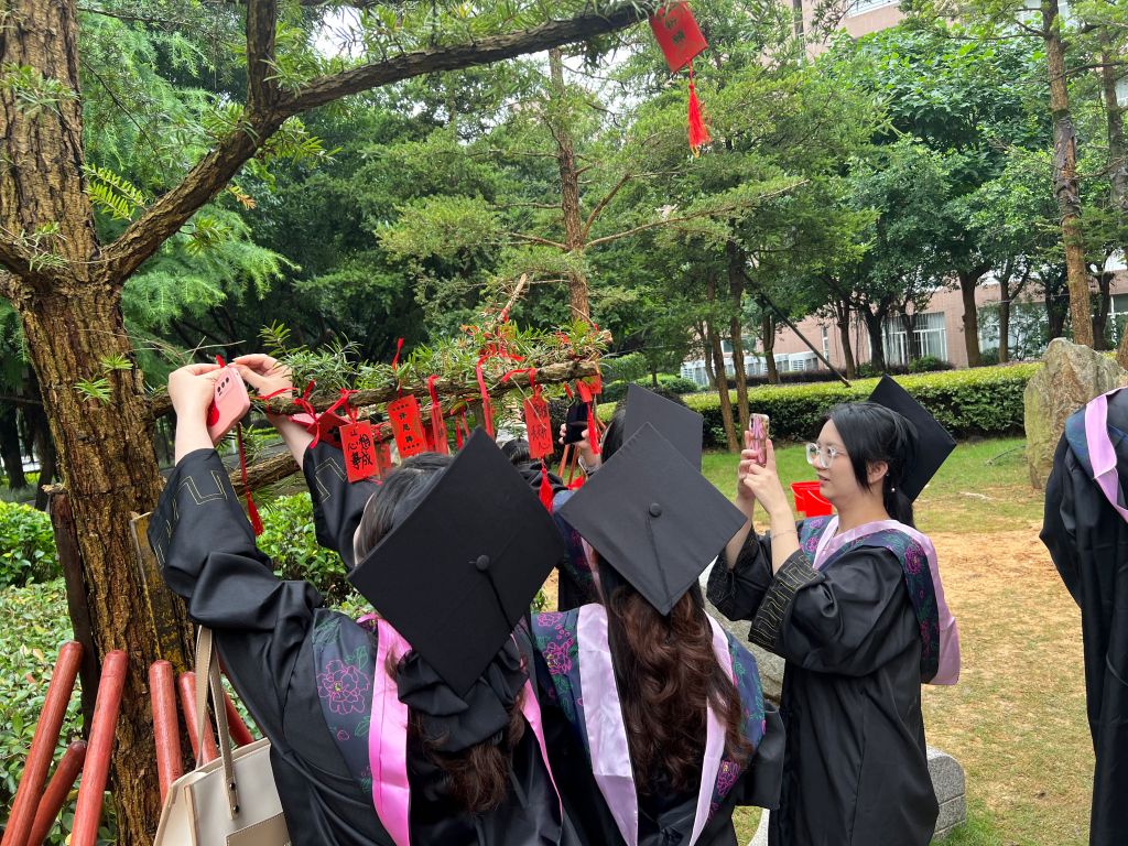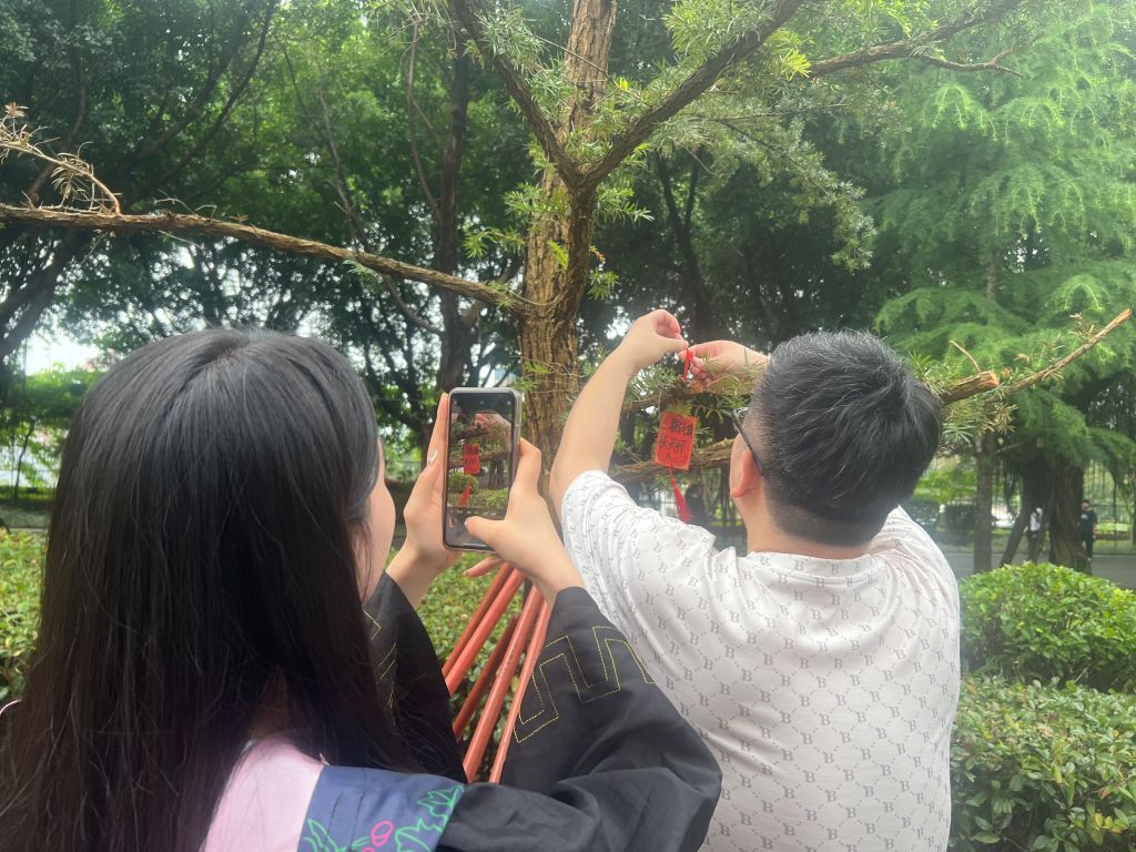 毕业生们用种下毕业树的方式为母校添一份新绿。校领导同毕业生们一起挥楸填土、回填细壤、夯实土层、提水浇灌.....植树现场欢声笑语、一派热火朝天的劳动景象,成为了一道美丽的风景线。参加劳动的师生一起用情用力,用浓浓的感恩之情亲手栽下树苗,并将自己的祝福写在许愿牌上,系在毕业树上。