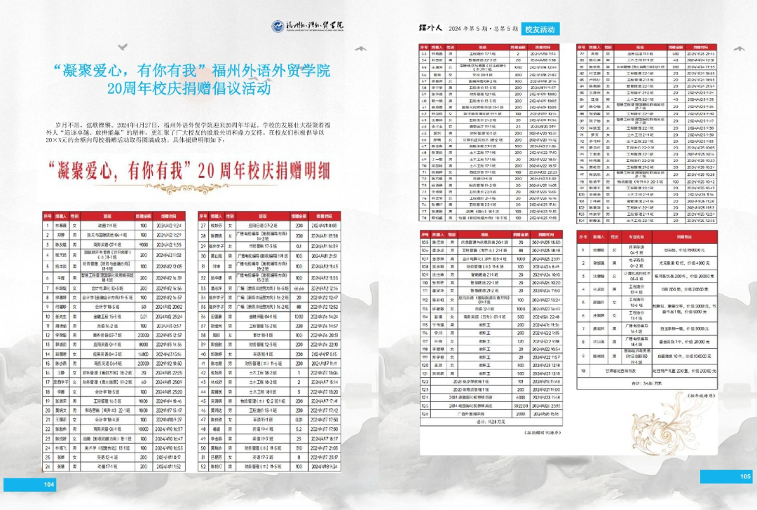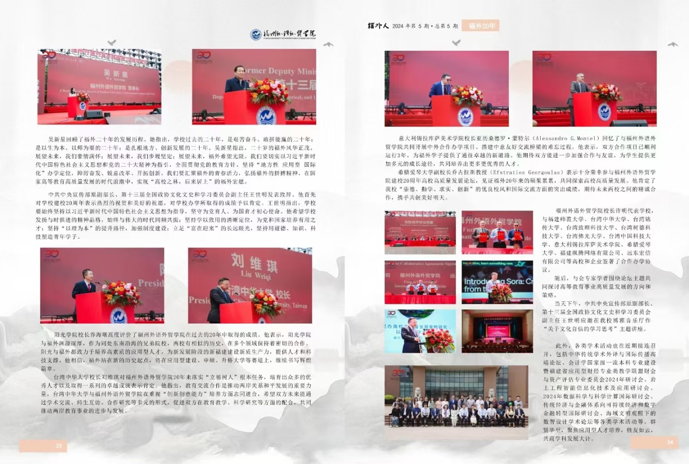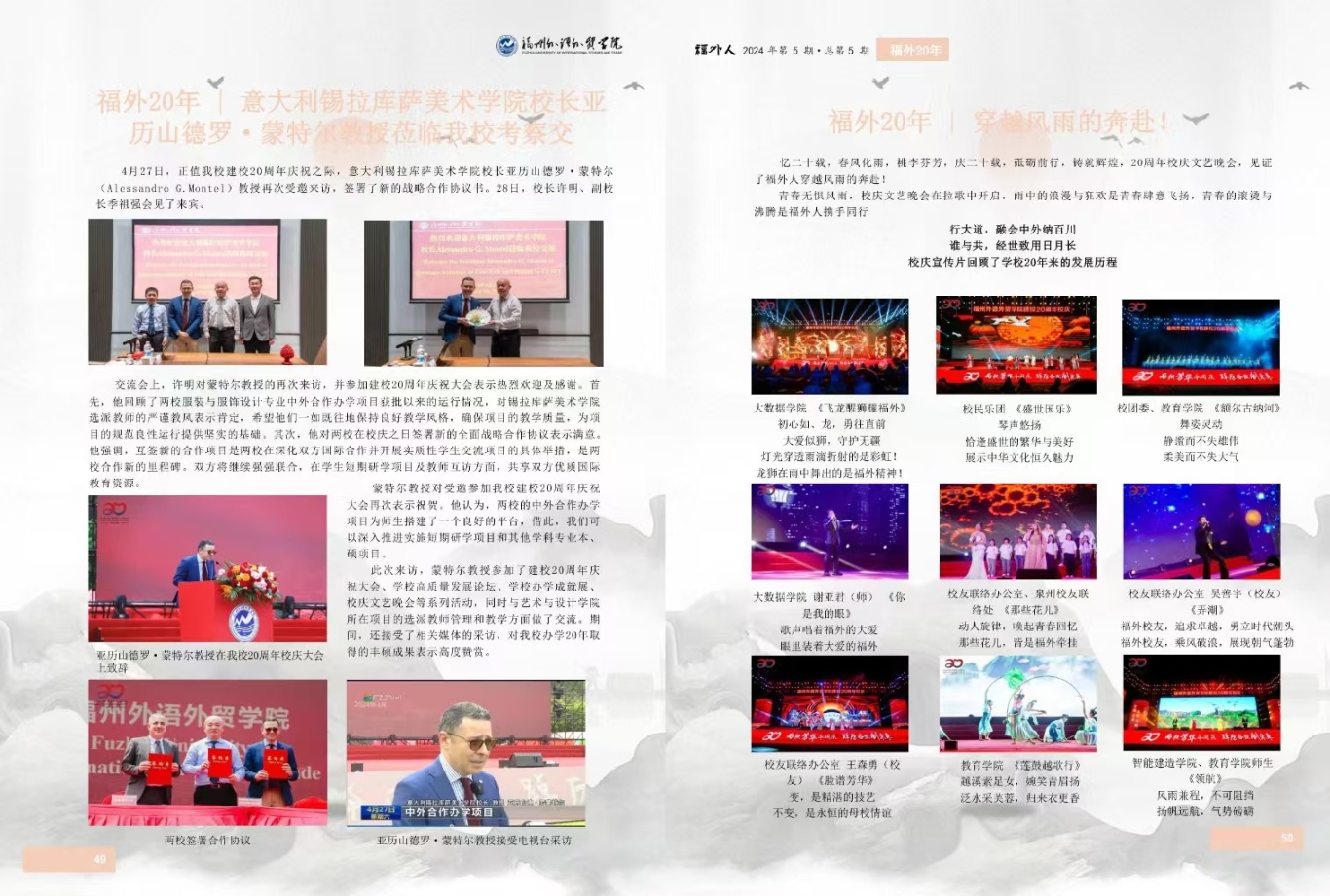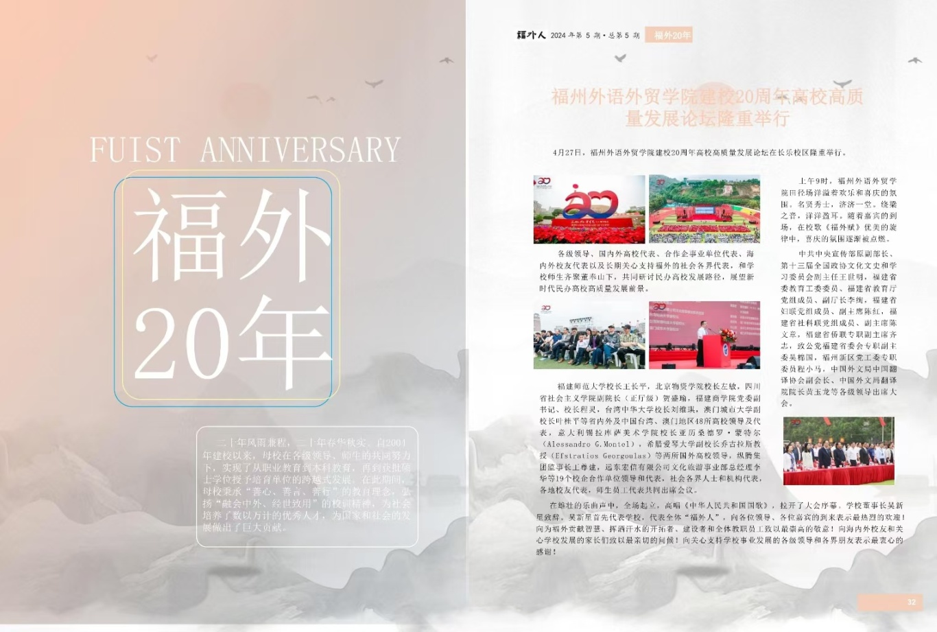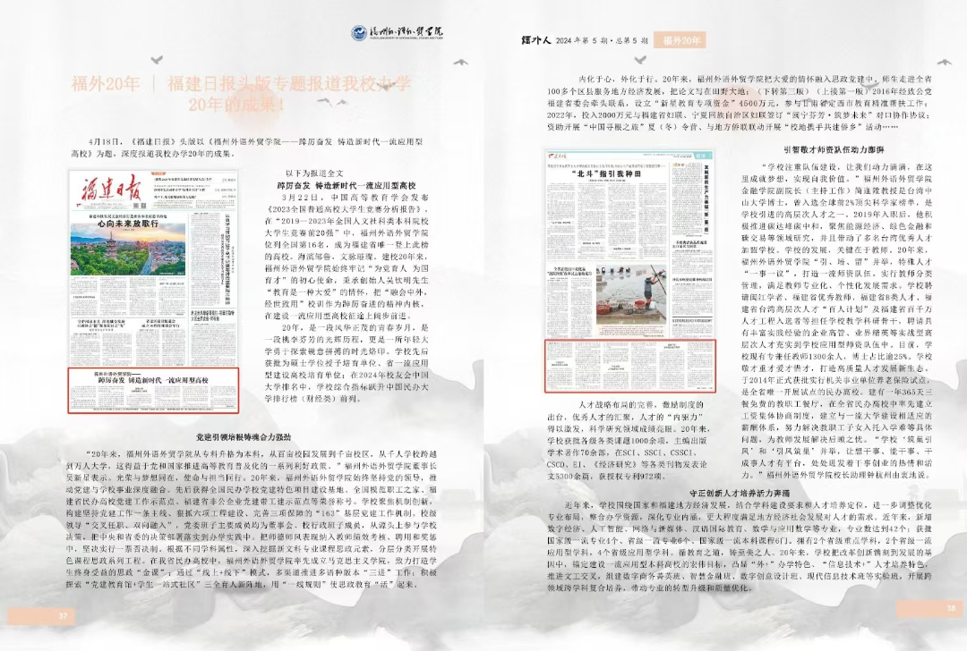 二十年风雨兼程,二十年春华秋实。自2004年建校以来,母校在各级领导、师生的共同努力下,实现了从职业教育到本科教育,再到获批硕士学位授予培育单位的跨越式发展。在此期间,母校秉承“善心、善言、善行”的教育理念,弘扬“融会中外、经世致用”的校训精神,为社会培养了数以万计的优秀人才,为国家和社会的发展做出了巨大贡献。