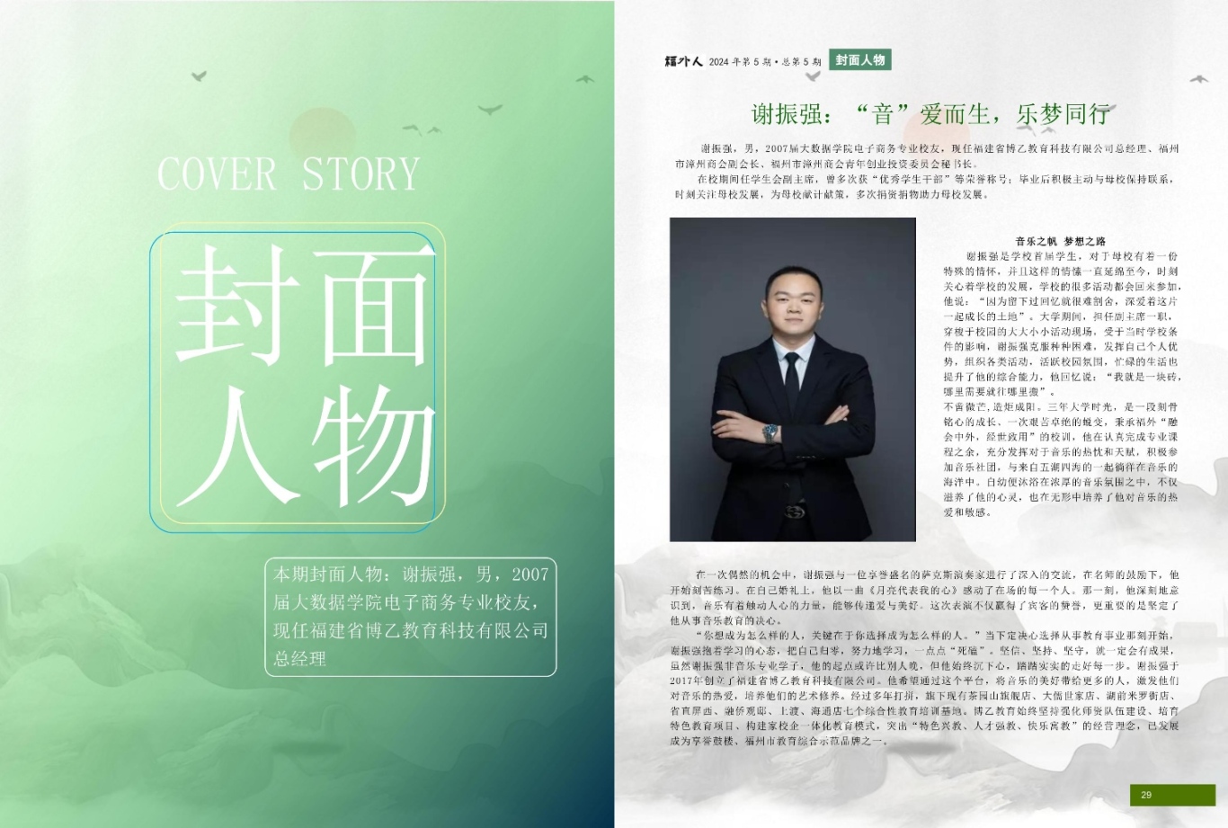本期封面人物:谢振强,男,2007届大数据学院电子商务专业校友,现任福建省博乙教育科技有限公司总经理