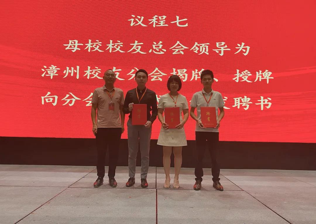 徐国立为漳州校友分会揭牌,并为理事会成员颁发聘书。