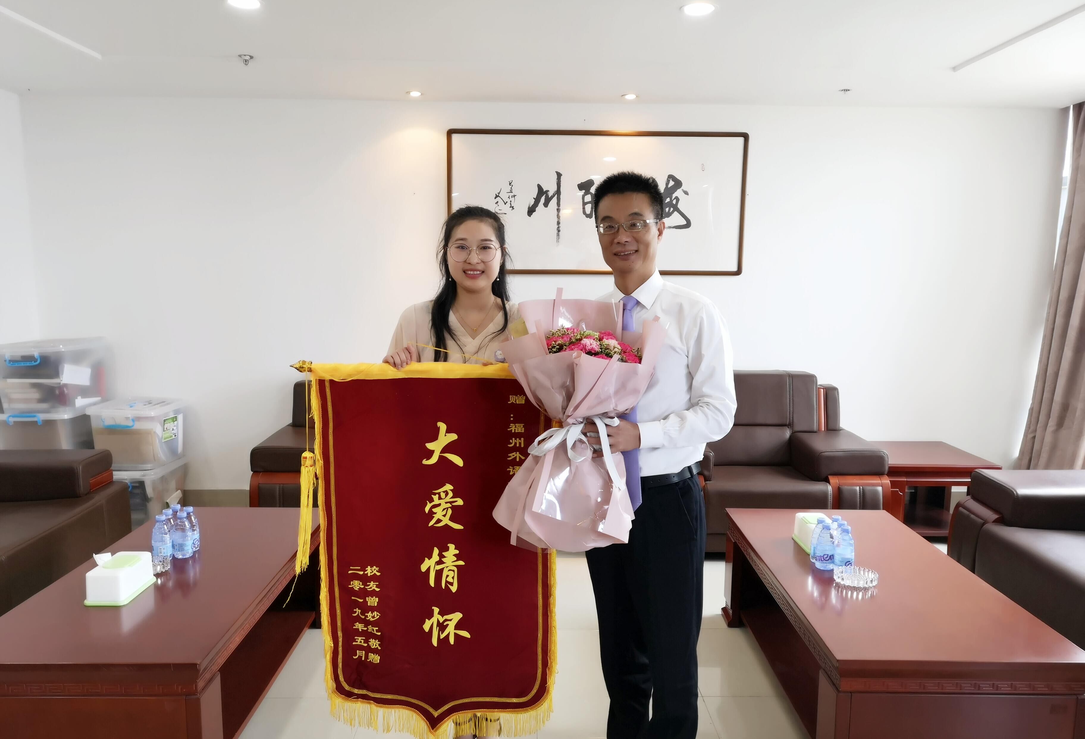 5月11日,在福州外语外贸学院举行15周年校庆活动当天,我校2015届财务管理专业受助校友曾妙红返校参加庆典,将一面书有“大爱情怀”的锦旗赠送给母校,同时向我校名誉董事长吴钦明先生递上感谢信。