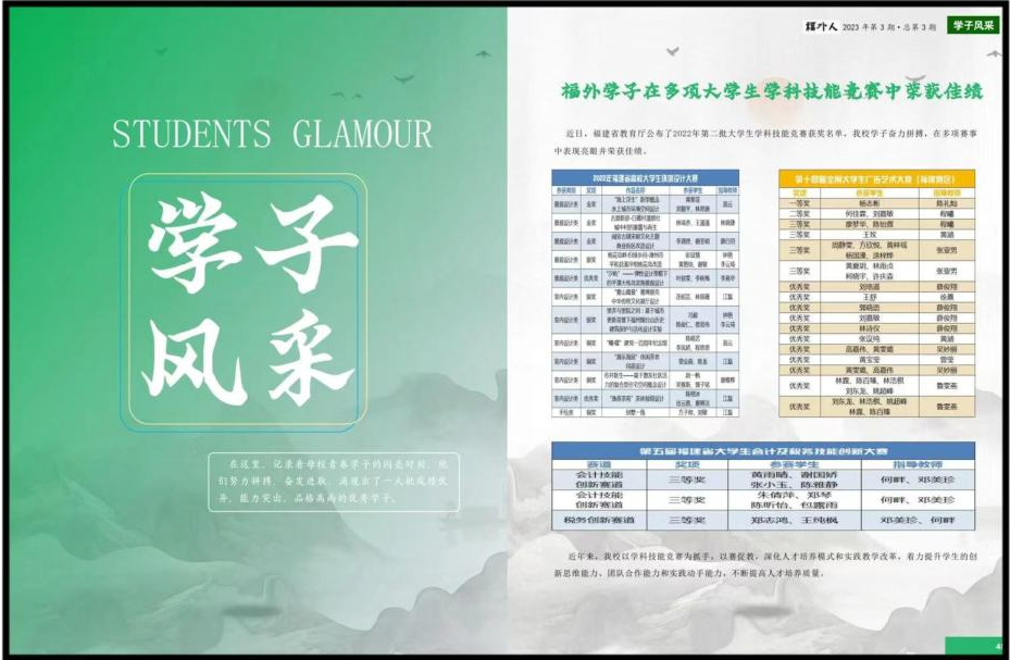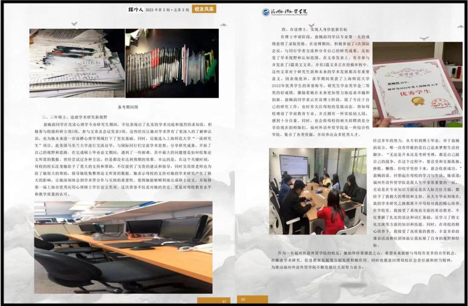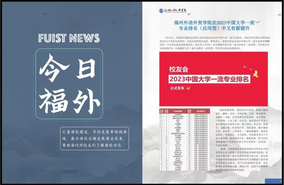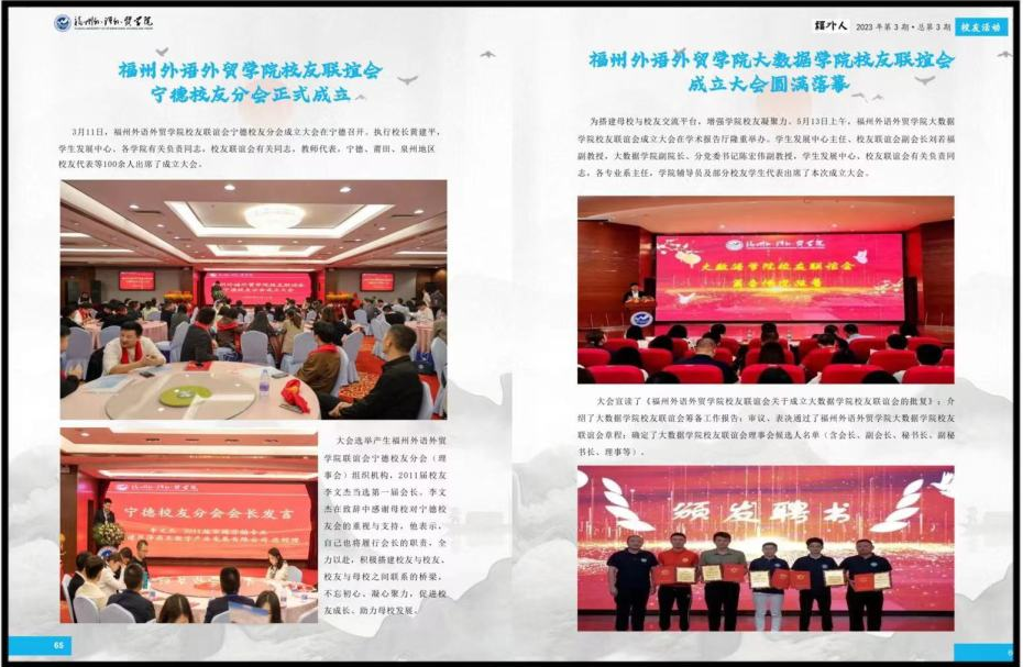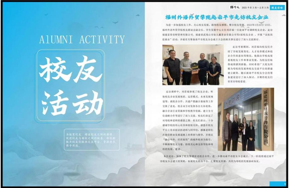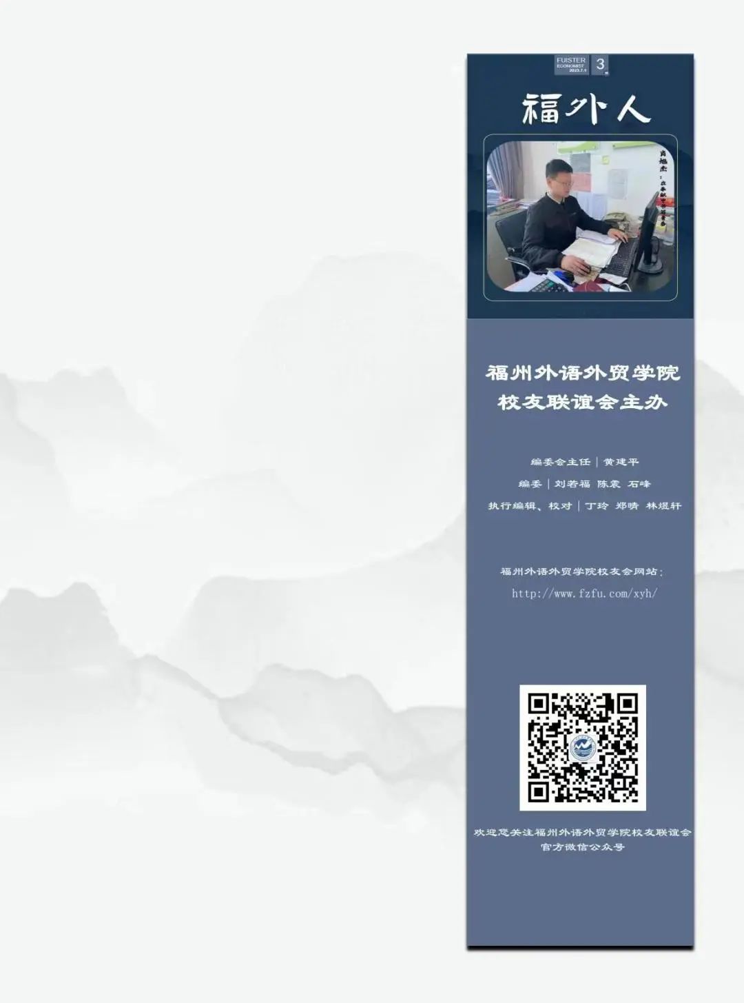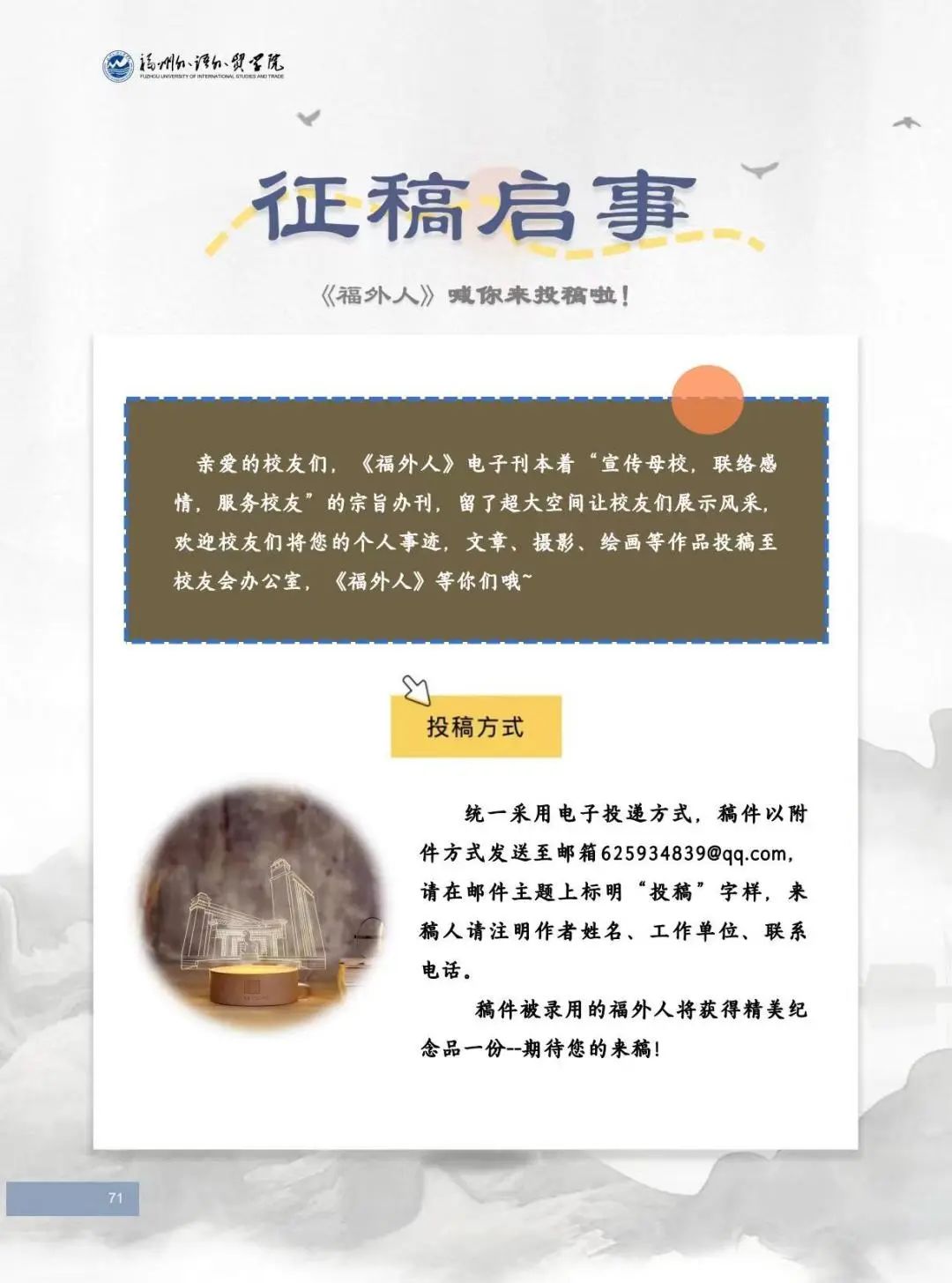 方法三:请在福州外语外贸学院校友会微信平台后台留言,格式为“年级+专业+姓名+所在城市/单位+邮箱地址”。第3期《福外人》电子刊将通过电子邮件的方式发送至您的邮箱中。