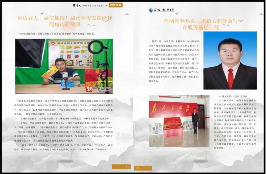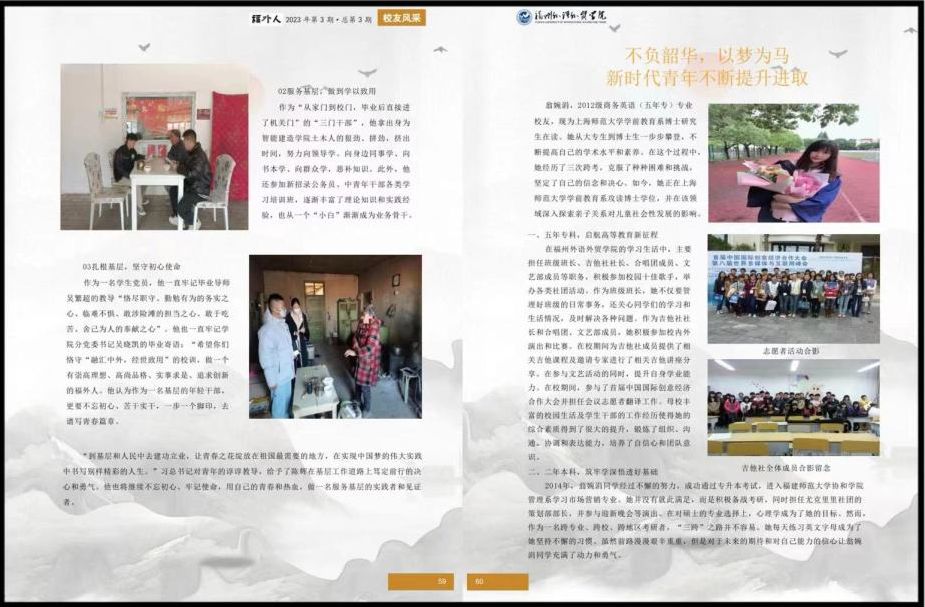 近年来,福外培育出一批又一批优秀的校友,他们在各自的岗位上无私奉献、贡献才智,用自己的业绩和成就传播了福外精神。让我们一同倾听他们的声音,走近他们的精神风貌和事业历程。