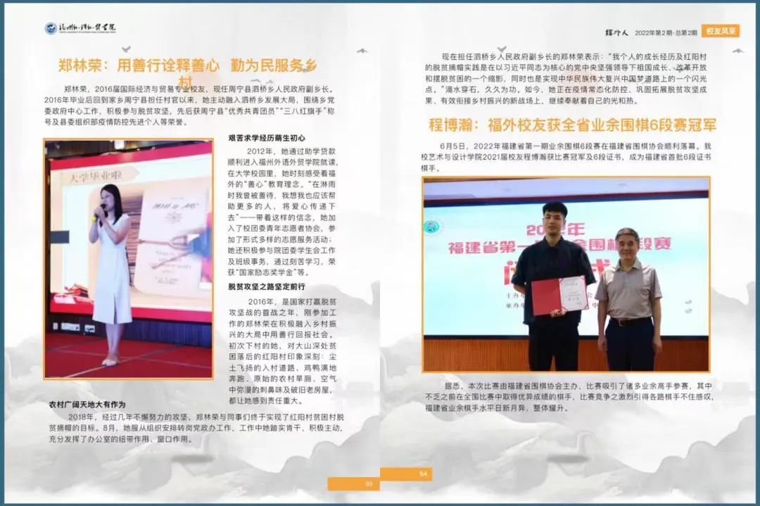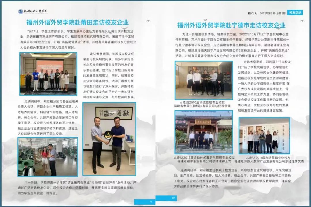 方法三:请在福州外语外贸学院校友会微信平台后台留言,格式为“年级+专业+姓名+所在城市/单位+邮箱地址”。第2期《福外人》电子刊将通过电子邮件的方式发送至您的邮箱中。