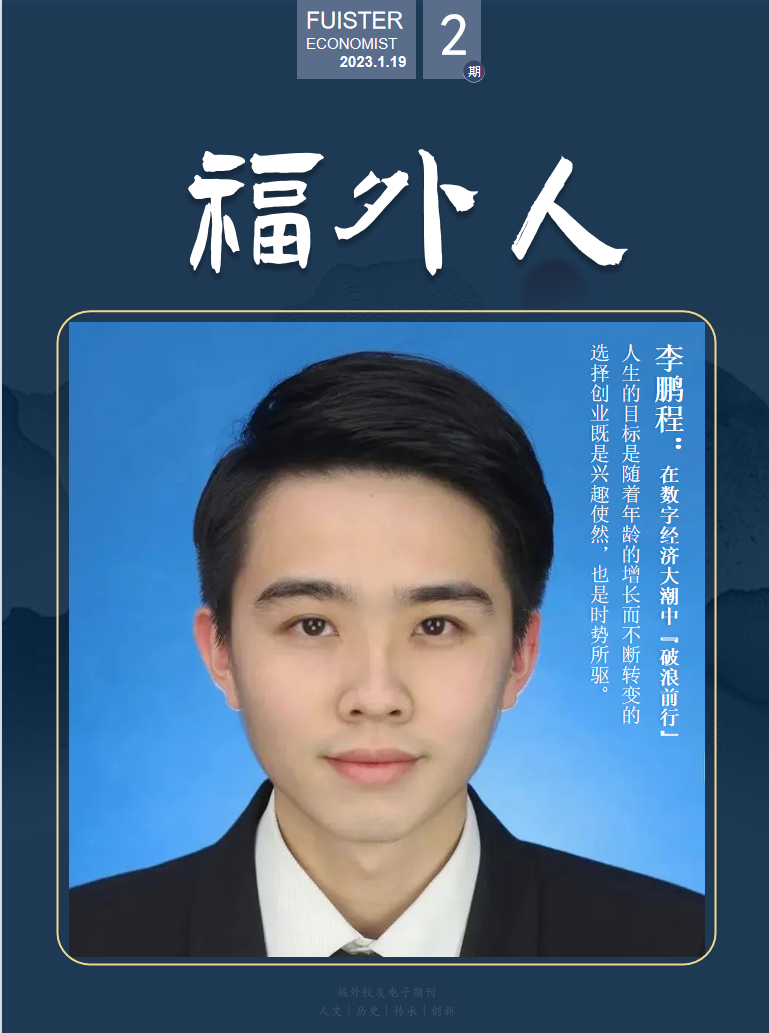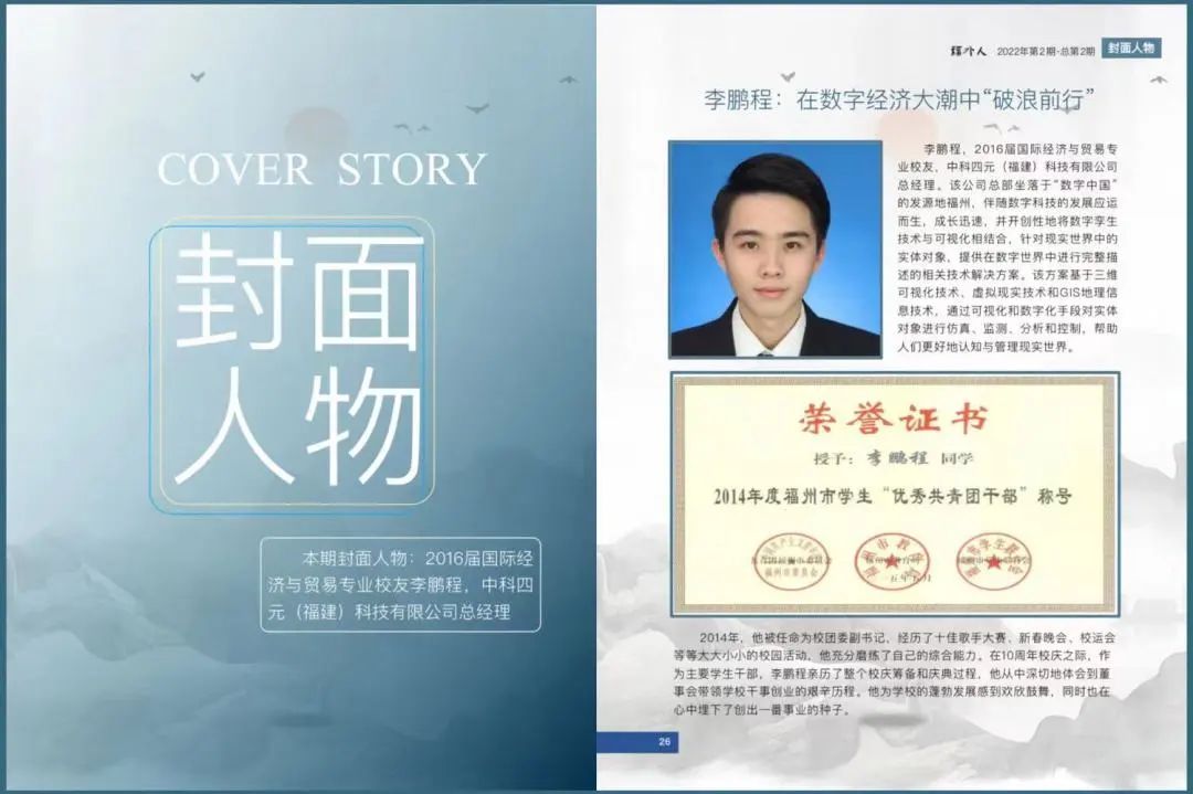 本期封面人物:2016届国际经济与贸易专业校友李鹏程,中科四元(福建)科技有限公司总经理。