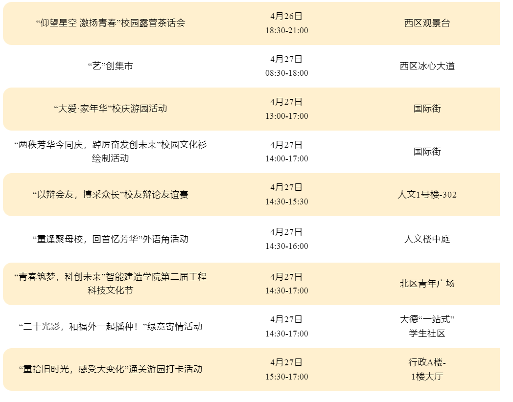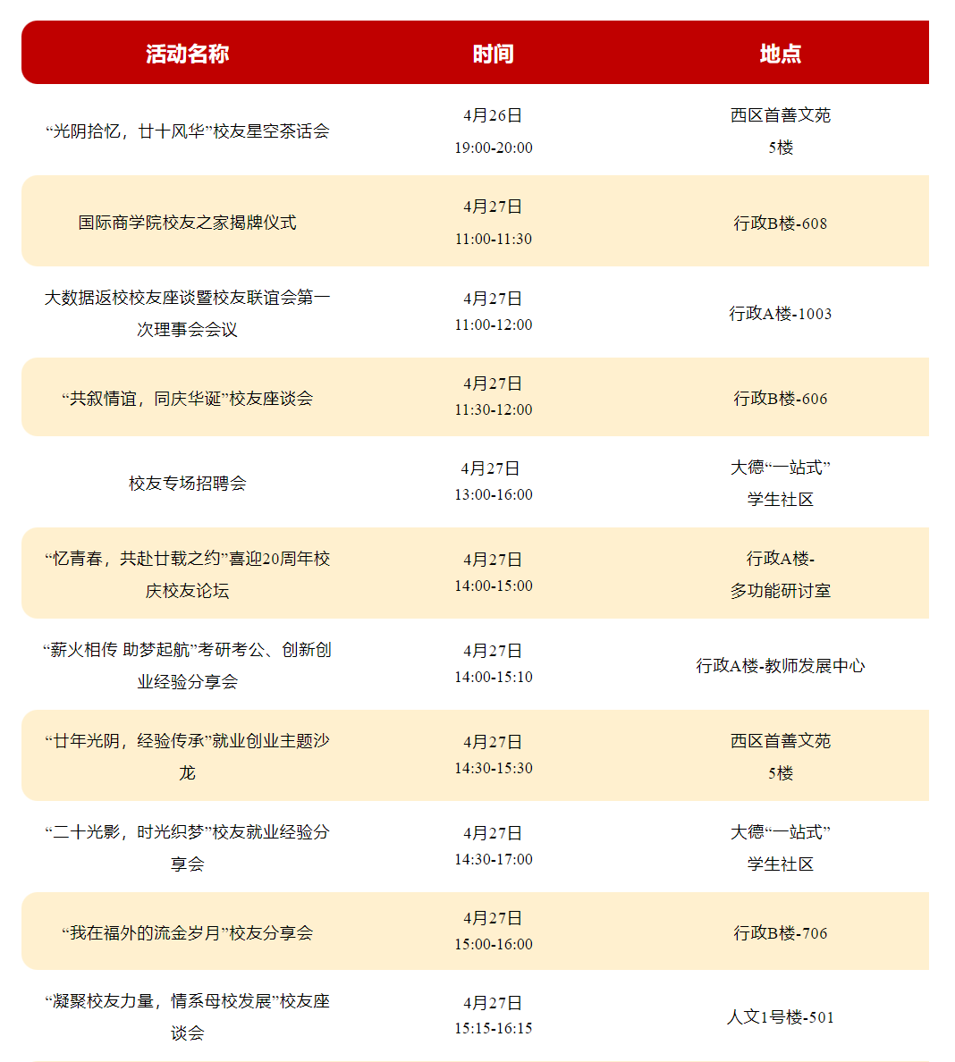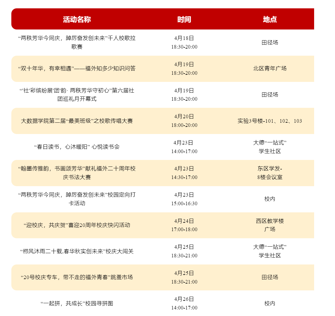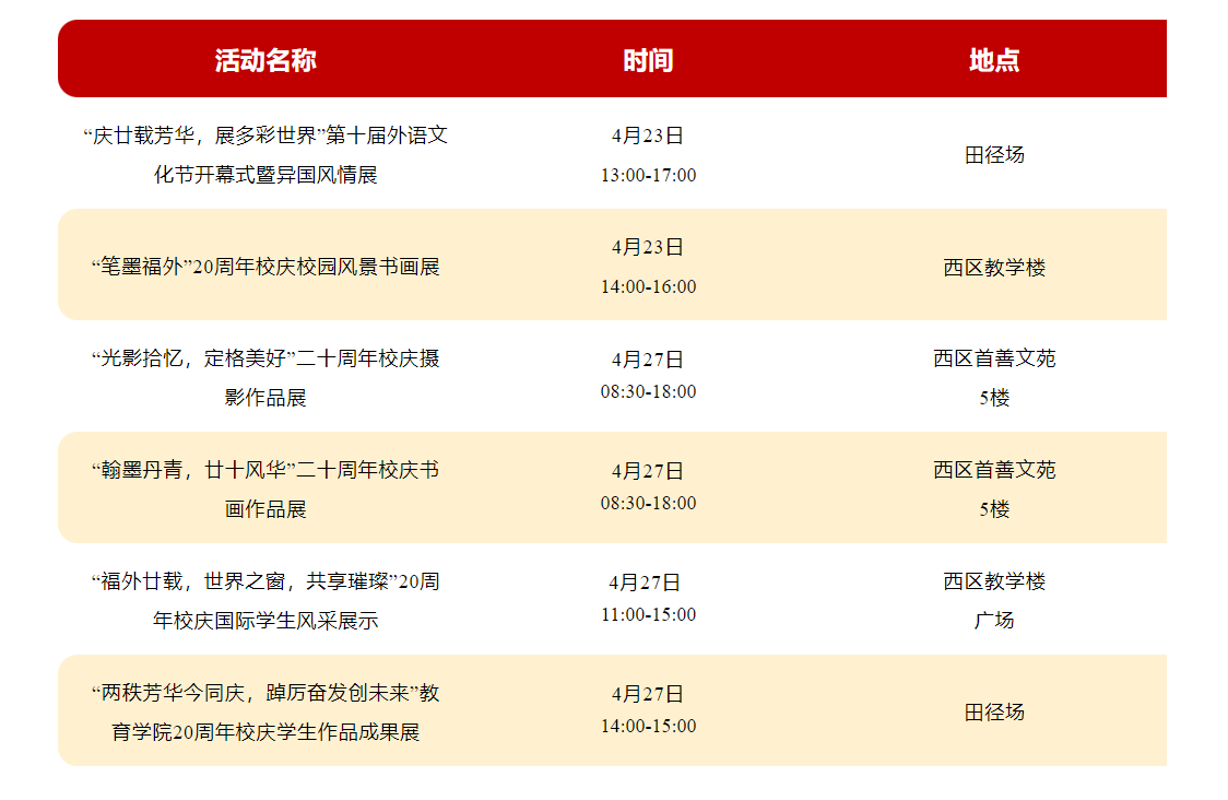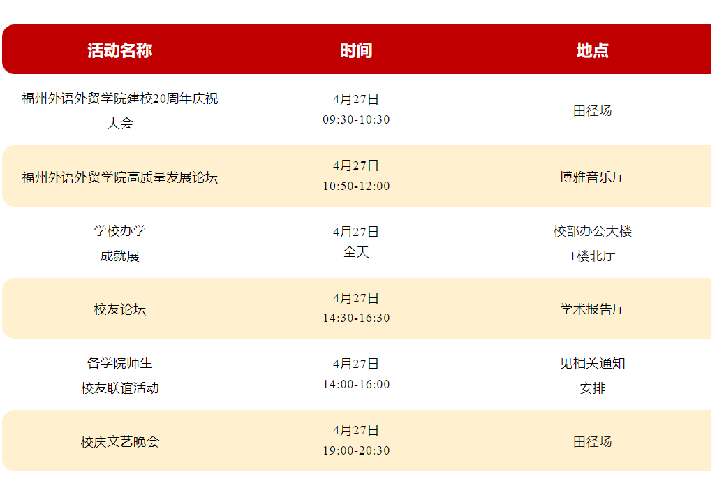 佳期渐进,盛事如约。20周年校庆是福外人回顾办学历史、展现辉煌成就的盛会,也是凝聚力量、增进情谊的平台。学校将以“两秩芳华今同庆,踔厉奋发创未来”为主题,于2024年4月27日隆重举行福州外语外贸学院建校20周年庆祝大会。校庆期间,学校还将举办福州外语外贸学院高质量发展论坛、学校办学成就展、校友论坛、校庆文艺晚会等系列活动。