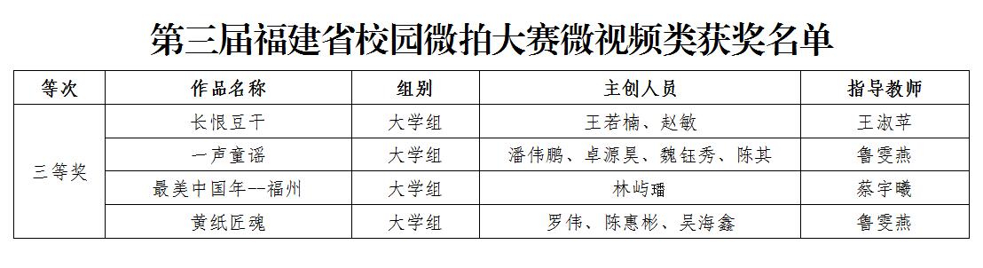 近日,由中共福建省委教育工委、福建省教育厅主办的第三届福建省校园微拍大赛评选结果公布,艺术与设计学院选送的4组微视频作品获得微视频大学组三等奖。