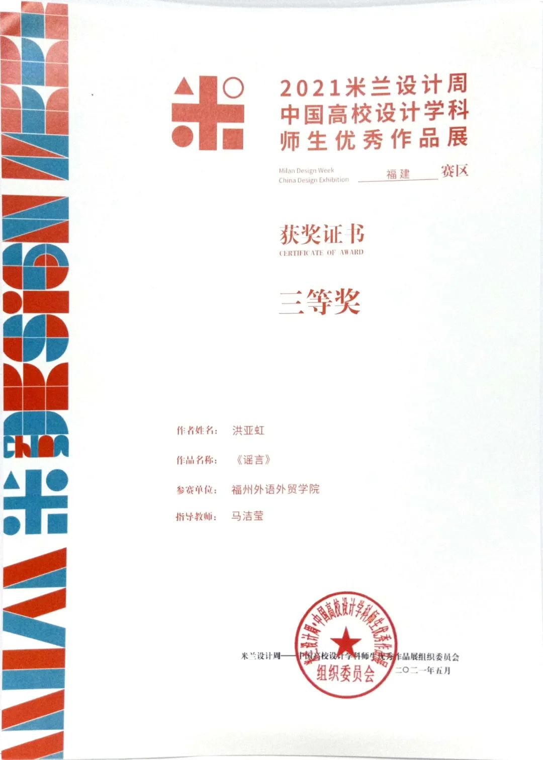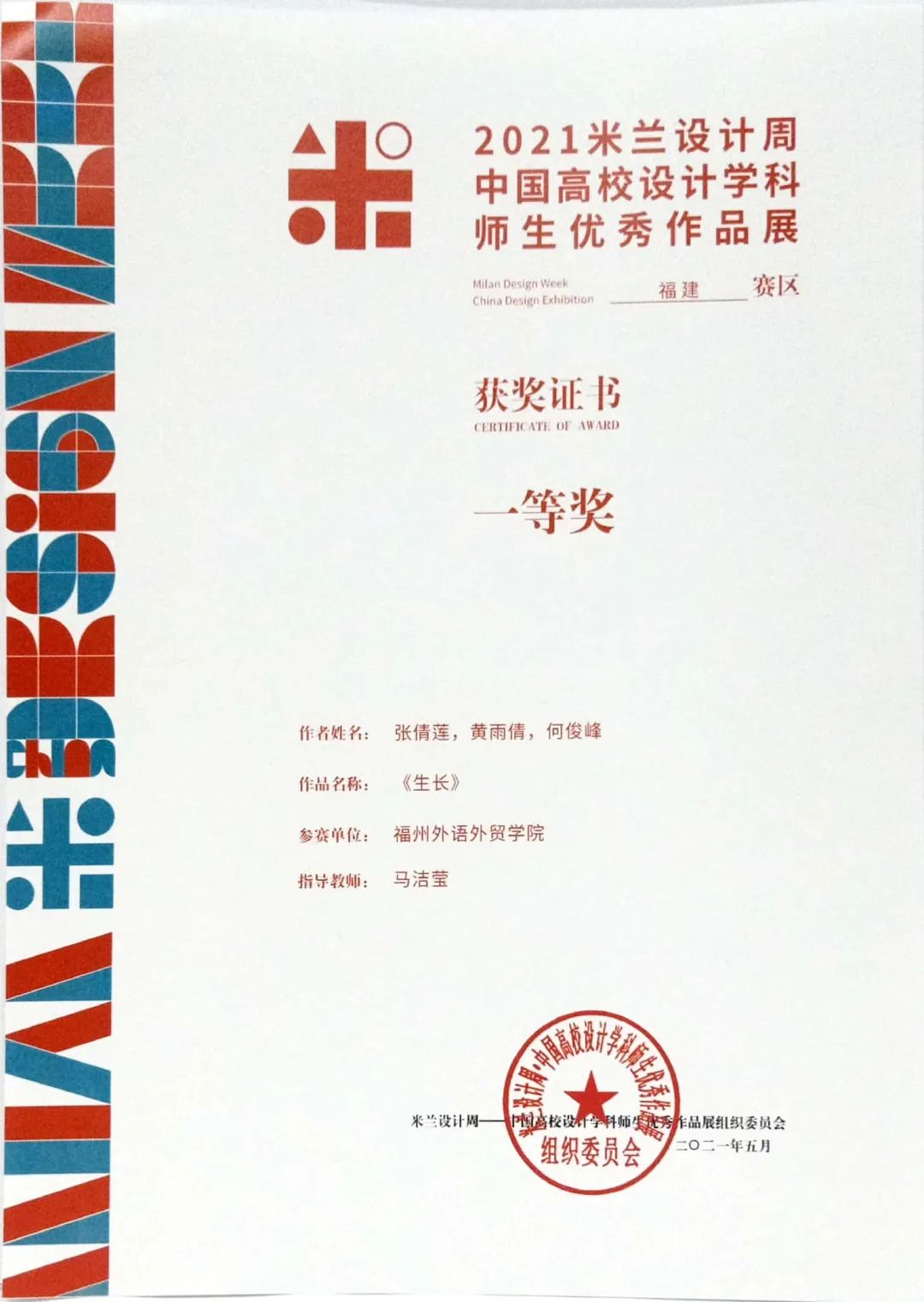 近日,中国教育国际交流协会、中国高等教育学会主办的米兰设计周—中国高校设计学科师生优秀作品展福建赛区落下帷幕,赛面向全国高等院校艺术、设计专业师生开放作品征集投稿,大赛共计收到全国近500所高校师生报名作品2万5千余作品一起同台竞技;最终,艺术与设计学院视觉传达设计系作品《生长》(作者:张倩莲、黄雨倩、何俊峰,指导教师:马洁莹)荣获福建分赛区一等奖,作品《学会说“不”》(作者:王雅婷、陈诗雅、张倩莲,指导教师:马洁莹)荣获二等奖,作品《Dialogue》《别遮住我》《谣言》分别获得三等奖。其中,作品《生长》《学会说“不”》进入国赛。