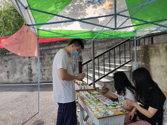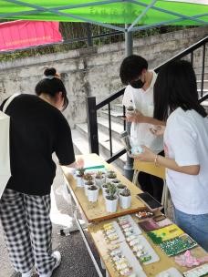 早上八点,志愿者们早早来到义卖点,按照前期策划的分工,有秩序地搬运物资、布置现场、摆放义卖小物品。志愿者们相互配合,卖力叫喊着口号,耐心介绍义卖物品和筹集善款的流向,引来了不少路过师生的围观。义卖现场热闹非凡,老师同学们纷纷献出爱心,多肉盆栽、奶油胶小镜子、奶油胶手机壳、奶油胶小发夹等手工艺品没多久便销售一空。