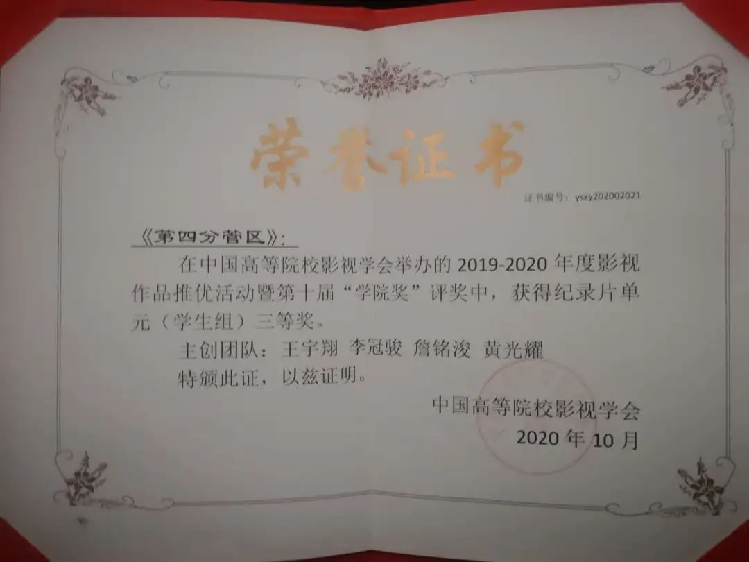 我院广播电视编导系教师李冠骏、吴谢巍受邀参加。李冠骏在影视前沿理论与艺术创作专题论坛作了题目为《从“现实”到“呈述”:看中国故事在纪实影像中的演进与流变》(作者:李冠骏、2017级广播电视编导专业学生龚莉玲)的论文分享。此外,在学会“学院奖”年度学术成果、影视作品推优颁奖晚会中,我校纪录片工作室师生团队创作的纪录片《第四分管区》(指导老师:沈岚、林莉娅,团队成员:王宇翔、李冠骏、詹铭浚、黄光耀)再获殊荣,夺得学生组最佳纪录片三等奖。