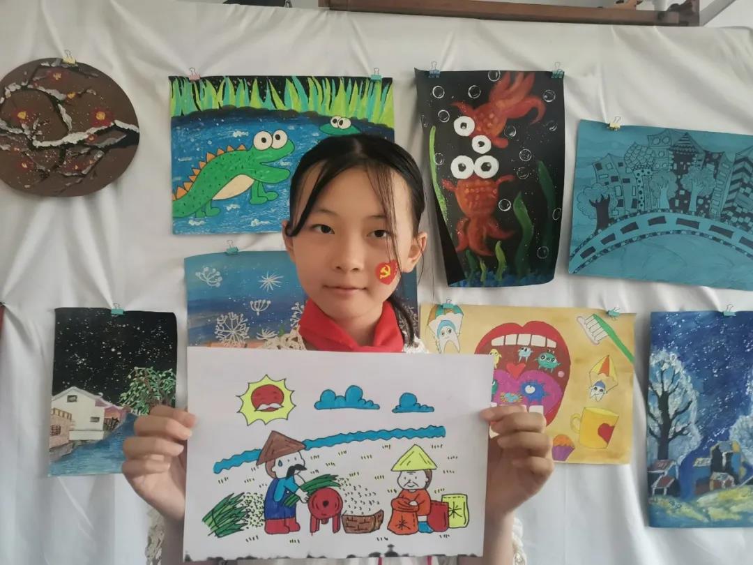 队员们为小朋友们放映红色动画,让大家细心观察,将观察到的场景用画笔画下。队员们耐心辅导,手把手指导小朋友们绘画。课程的最后,队员们邀请小朋友们上台为大家展示自己的作品。通过一幅幅生动的图画,传递出小朋友们对祖国的美好祝福、对家乡的深情赞美、对未来的无限憧憬。