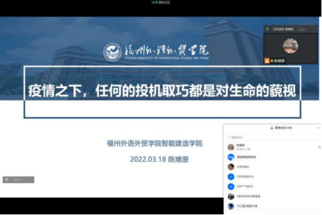 为了落实学校疫情防控闭环式管理期间各项工作的要求,安抚同学们的心情,凝聚抗疫力量,传播抗疫知识,智能建造学院于3月18日通过腾讯会议平台开展了主题班会。