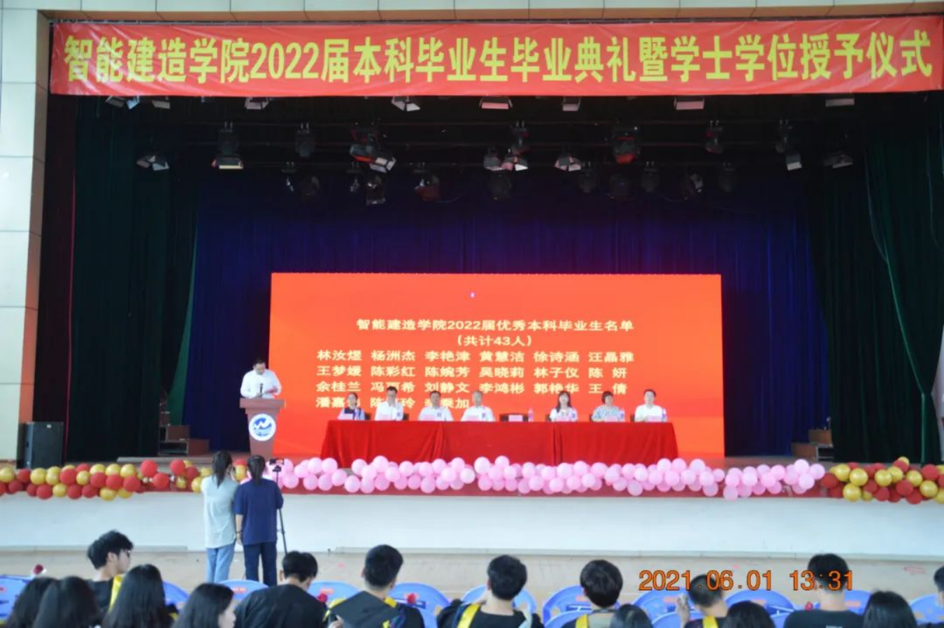 6月1日下午14:00,智能建造学院2022届毕业典礼暨学士学位授予仪式在体育馆隆重举行。出席本次毕业典礼的有我院院长毕贤顺,副院长、分党委书记吴晓凯,智能建造系主任吴能森,工程管理系主任林珊,工程造价系主任黄艳丽,土木工程系主任林伟,学院办公室副主任王欣。参加本次典礼的有学院教师代表、各年级辅导员以及2022届全体毕业生。典礼仪式由办公室主任汪翠茹主持。