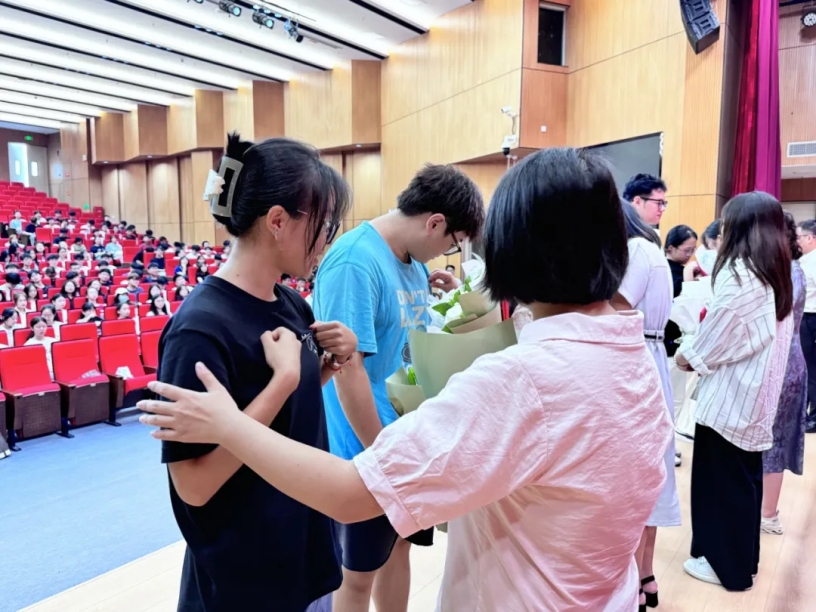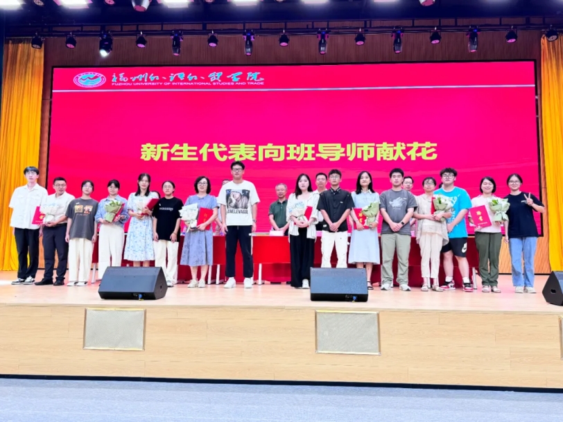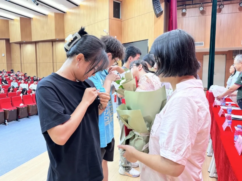 班导师献花,班导师为新生佩戴校徽,寄语新生以新身份启程,勤勉自强,逐梦翱翔。