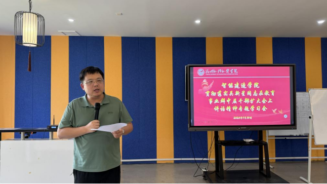 为深入贯彻落实吴新星同志在集团教育事业群中层干部扩大会上的重要讲话精神,准确把握集团教育事业发展新阶段的核心战略,9月30日下午,智能建造学院在教5403VR实训中心组织召开了专题学习会。会议由学院办公室副主任许婷婷主持,副院长、分党委书记吴晓凯担任主讲,学院全体教职工参会学习。