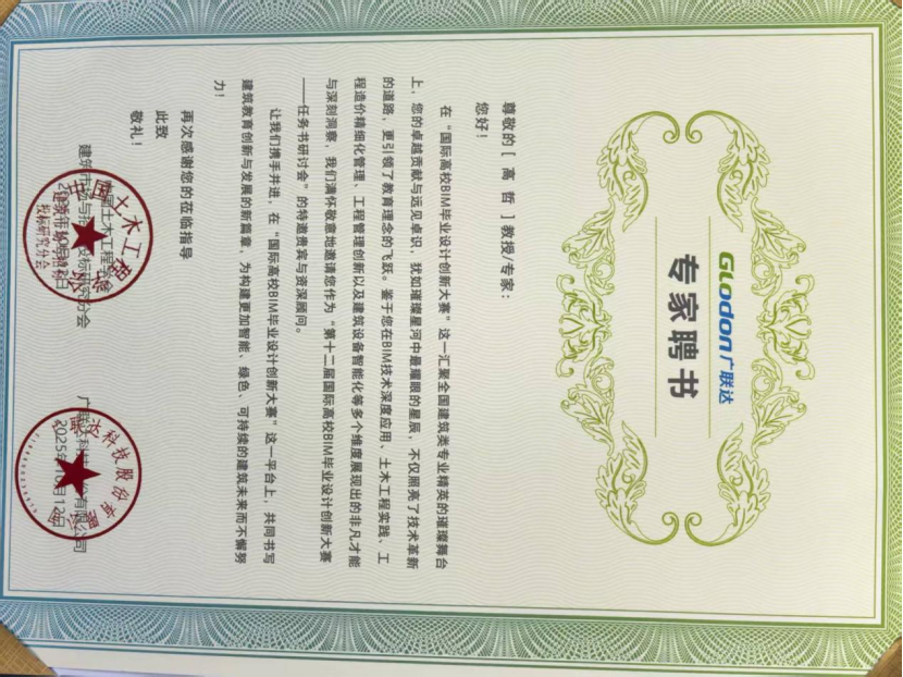 在备受瞩目的专家聘书颁发环节,广联达相关模块负责人为各赛项任务书专家颁发了聘书。高哲博士与其他与会专家一同上台接受了聘书并合影留念,正式受聘参与本届大赛的评审与指导工作。
