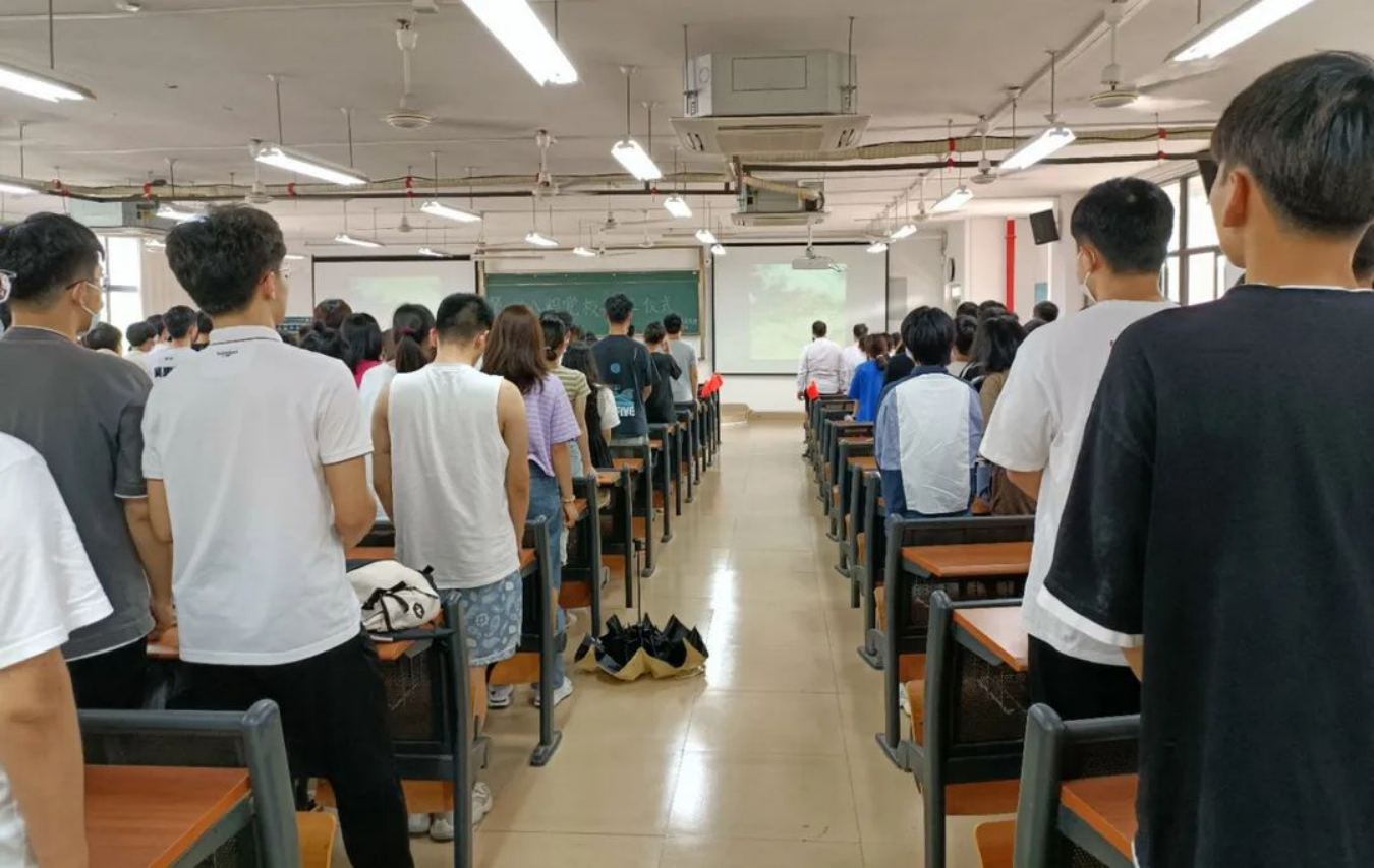 开班仪式在庄严而响亮的国歌中正式拉开帷幕,老师和同学们严肃站立,俨然形成了一种庄严的氛围。歌声嘹亮、神情坚定,整个教室都飘荡着一股激昂的精气神。会议伊始,由分党校教务长王欣老师宣读智能建造学院分党校第三十八期党校培训班开班决议。