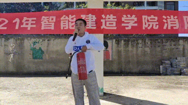 消防演练现场校安全办公室郭正飙老师向全体参训人员,详细讲解了手提式灭火器的使用方法、注意要点,并分步骤向全员做了演示。