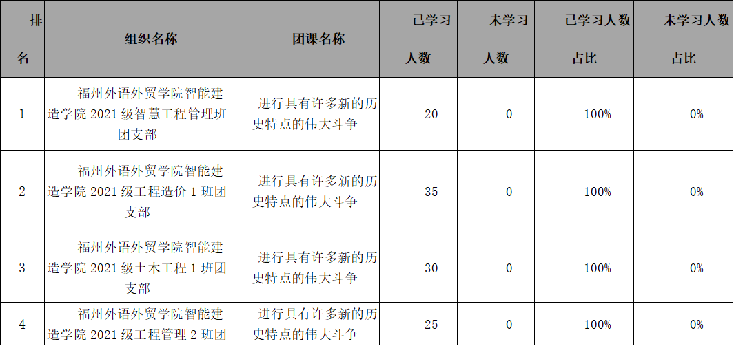 根据数据显示,第十二季“青年大学习”第八期的排名,智能建造学院共有35个团支部,均在规定时间内提前完成了学习任务,完成率为100%,(其中19个支部在周三前便完成了任务,积极主动性较高)。