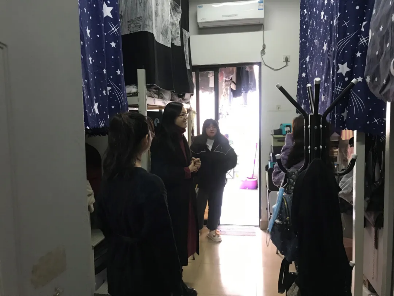 吴繁超老师在走访的过程中仔细查看了学生宿舍的清洁卫生、环境布置、安全措施,并与大家就学习生活、就业方向等内容进行亲切交谈。她建议大家从专业能力、时间规划和人际交往等各方面锻炼自己,要把经历当作财富,从小事做起,踏实进取。走访中,就同学们提出的就业方向困惑,吴老师结合自己多年的企业经历给同学们提出了就业建议。