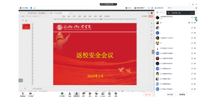 为确保新学期学生能够安全、有序的返校,增强学生的安全防护意识,调整好身心状态以便更好地投入到新学期的学习生活中去。我院辅导员于2月24日晚组织学生召开2024年春季学生返校安全线上主题班会。