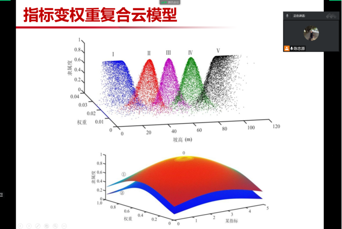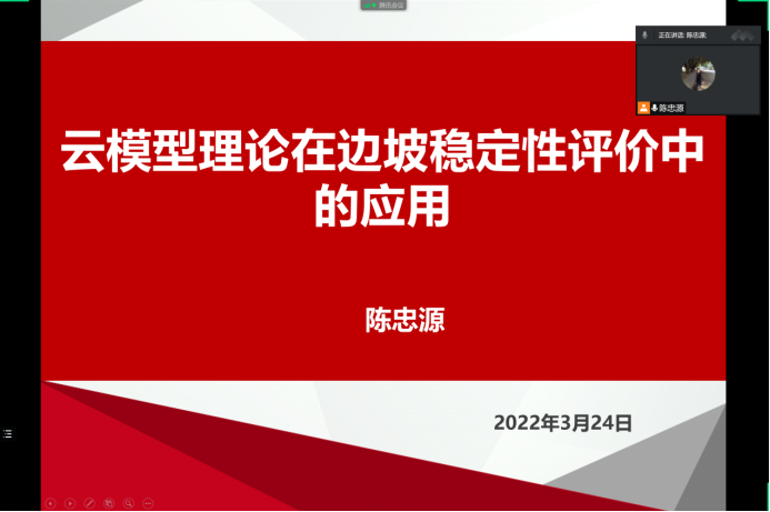 2022年3月24日,陈忠源副教授在腾讯会议上为全院师生开展了《云模型理论在边坡稳定性评价中的应用》专题讲座。陈忠源老师从云模型在边坡稳定性评价的应用背景以及当前存在的问题引入主题,介绍了评价指标隶属于各稳定性级别的综合云模型的建立方法,评价指标的复合云模型的建立以及云模型评价方法计算结果的判定,同时以福建省连江县黄岐镇对台客运站边坡为案例进行了现场演示。
