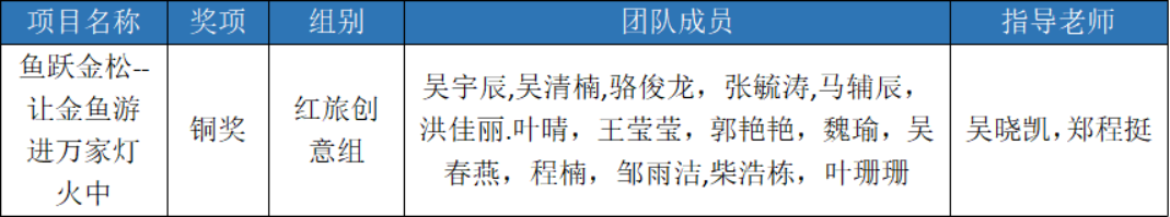近日,福建省教育厅公布了第八届福建省“互联网+”大学生创新创业大赛决赛获奖名单,在与来自全省244所学校的76万名师生、近20万个项目的激烈竞争中,我院《鱼跃金松——让金鱼游进万家灯火中》(成员:吴宇辰、吴清楠、骆俊龙、张毓涛、马辅辰、洪佳丽、叶晴、王莹莹、郭艳艳、魏瑜、吴春燕、程楠、邹雨洁、柴浩栋、叶珊珊,指导老师:吴晓凯、郑程挺)获得省赛铜奖。